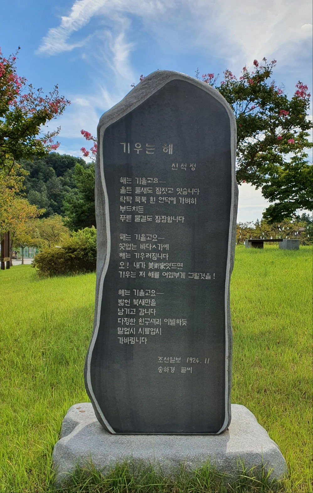 신석정시인을 대표하는 말로 ’목가적 시인‘이라는 표현이 있는데요, 어제는 신석정시인의 일대기 이야기를 들으면서 앞으로는 그를 윤동주처럼 ’민족시인’이라고 호칭해야겠다 생각했어요. 또 그의 시 <그 먼 나라를 아십니까>처럼 잘 알려진 시도 좋았지만 덜 알려진 시들을 들려주는 강사의 목소리를 눈을 감고 들었습니다. 부안의 신석정문학관에 가면 비석으로 만날 수 있는 <기우는 해, 1924>가 데뷔작품으로 알려져 있지만, 이보다 더 일찍 쓴 시 <가을밤비 1921> 가 발견되어 고어체로 쓰여진 시를 읽었지요. 시인을 꿈꾸던 습작시절의 시라고 합니다.