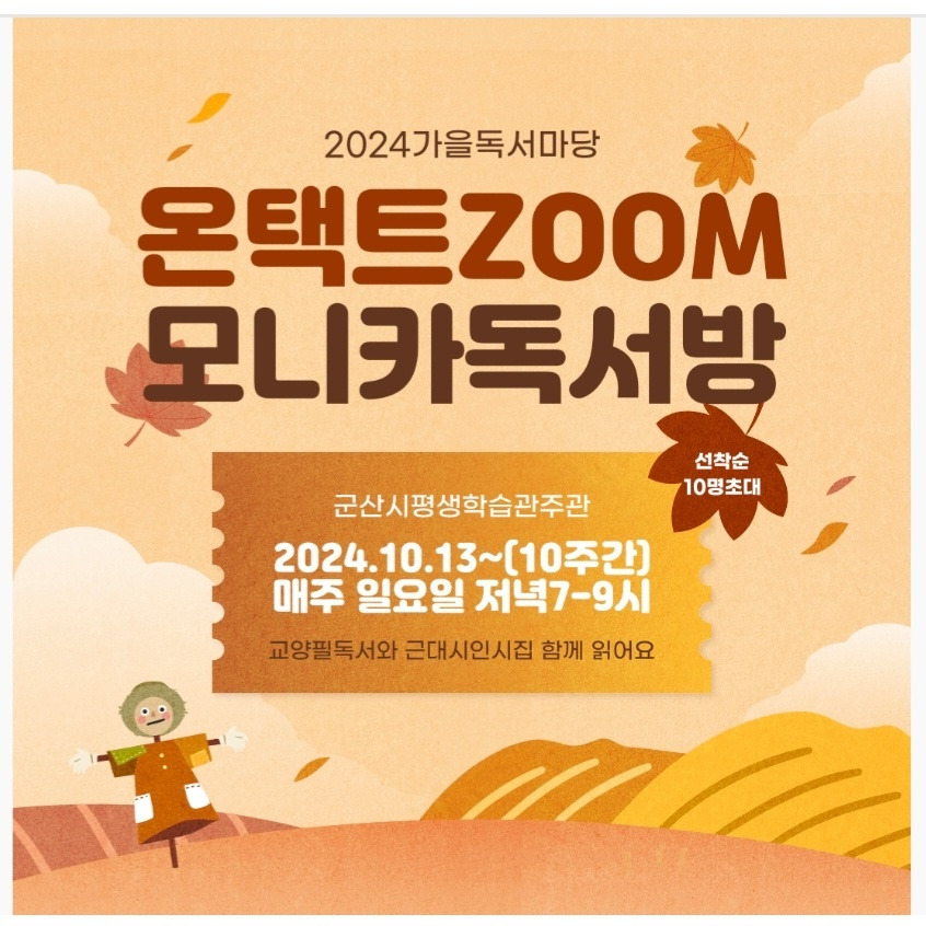 하여튼 한글과 우리문화를 사랑하는 제가 작은 프로그램 하나 진행해요. 군산평생학습관 주관으로 열리는 ‘온택트 줌수업, 독서마당’입니다. 이왕이면 주말에 시민들이 책을 가까이하는 문화를 만들어보자는 의견을 듣고서, 수업을 일요일 저녁으로 정했어요. 10주간의 수업이고요, 2주에 1권씩, 최소한 5권의 책을 읽고, 의견을 나누는 온라인 독서시간입니다. 특별히 매주 ‘가을이면 생각나는 시인과 시’를 한편 이상 소개하고 회원들과 낭독하려 합니다. 선착순 10명이라고 하니, 관심 있으신 분은 저와 함께 가을 독서산책 하시게요. 완주하시는 분께는 모니카의 특별선물도 있고요.. 개인적으로 문자 또는 톡주세요. (010-3650-1878). 오늘은 김용택시인의 <가을>입니다. 봄날의산책 모니카