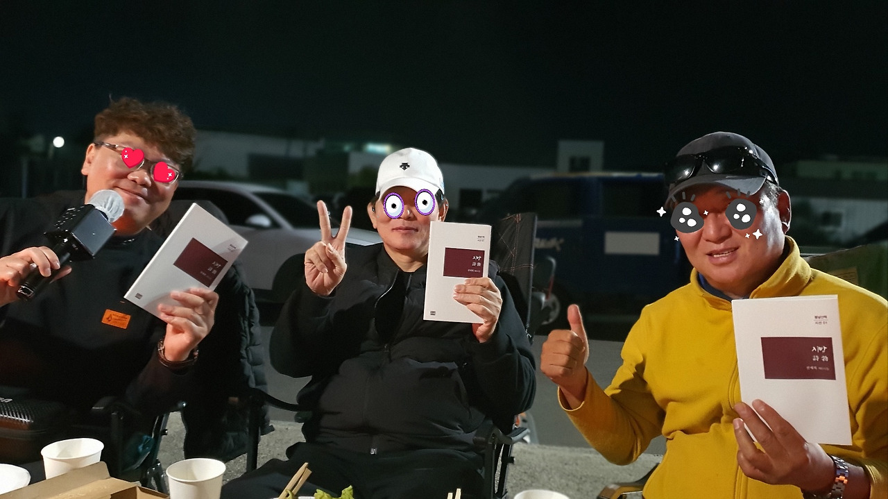 저녁식사를 좀 특별한 곳으로 초대받았는데요. 군산과 서천(장항)을 잇는 동백대교 아래, 바닷물이 찰랑거리고 낫시꾼들이 터를 잡는 곳, 전팡판 야경으로 군산이 멋지게 보이는 곳에 캠프파이어를 펼치고, 먹거리를 손수 다 준비한 남편지인들의 초대였지요. 빈손으로 가기 미안해서, 또 제게 한강작가의 <흰>이라는 작품을 처음 건네준 지인이 계시길래, 저도 시집<시발>을 준비했어요. 혹시나 형편이 된다면 바닷가에서 들려오는 시낭독은 어떤 모습일까 상상하면서요.