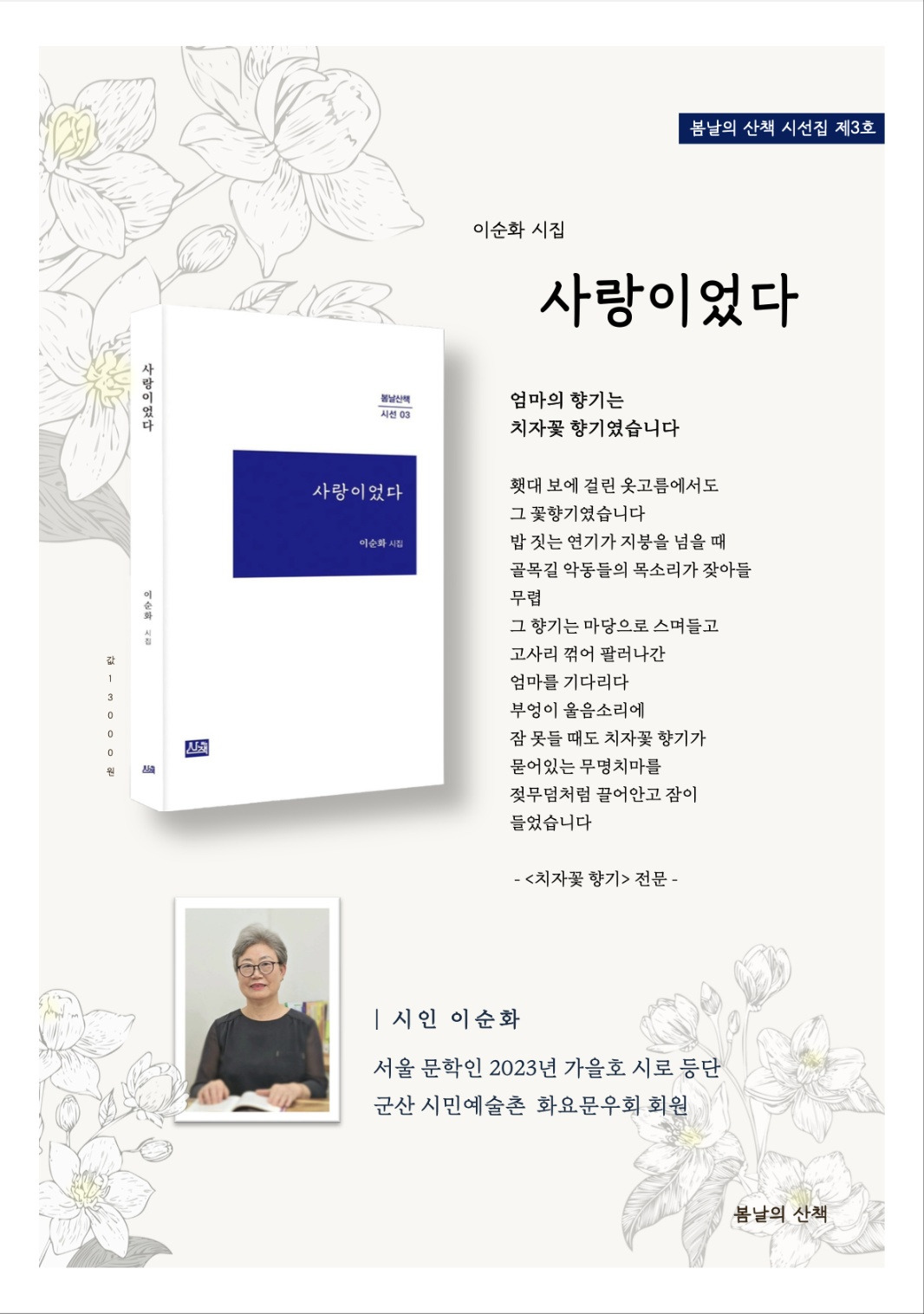 말 그대로 잔치날이니, 지나가시다가 생각나시거든 무조건 들어오셔서 축하의 박수 보내주시길 바랍니다. 요즘 세상, 글쓰기 쉽고, 책 만들기 쉽다 하여도, 두가지 부류 밖에 없지요. 쓰는 사람과 못쓰는 사람, 만든사람과 못 만드는 사람. 즉, 해보지 않은 사람은 해 본 사람의 영역을 감히 넘 볼 수 없지요. 그래서 저는 작가들께 자신있게 소리내라 요청합니다. ’나도 내 이야기가 담긴, 책 쓴 사람이다‘라고요. 단지, 책을 낸 후 더욱더 겸허하게 자신을 되돌아보고 글쓰기에 진실한 사람이 되도록 노력하는 일, 마땅한 도리입니다. 오늘은 첫 시집을 출간한 이순화 시인의 구순 넘은 친정엄마의 목소리가 들어있는 시 <저장해놓은 일번>을 소개합니다. 봄날의 산책 모니카