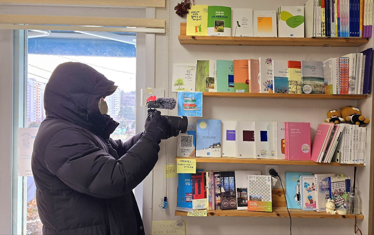 책방으로 돌아와 도올 선생의 중용강의를 듣고 있는데, 카메라 한 대가 들어오더군요, <EBS고향민국>이라는 다큐프로그램이라고, 함께 온 해설사께서 책방 내부를 중심으로 질의 응답을 하셨어요. 갑자기 PD가 제게 인터뷰해도 되냐고 묻더군요. 화장기 하나없는 꽤재재한 모습이라, 거절했는데, 마을사람으로 인터뷰를 하고 싶다고, 특히 시집이 많은 것이 눈에 띈다고 했어요. 그 말에 혹 하니, 인터뷰에 응대했습니다. 군산을 소재로 쓴 시인들의 작품이 궁금하다고 해서, 마침 전재복시인의 시집 <시발>을 보이며 목차를 읽어주었지요. PD의 호기심으로 상당한 분량의 촬영이 있었답니다. 3월 어느날 나온다하니, 그때 제 모습이 볼만하면 링크하고요, 아니면 저만 보겠습니다.^^