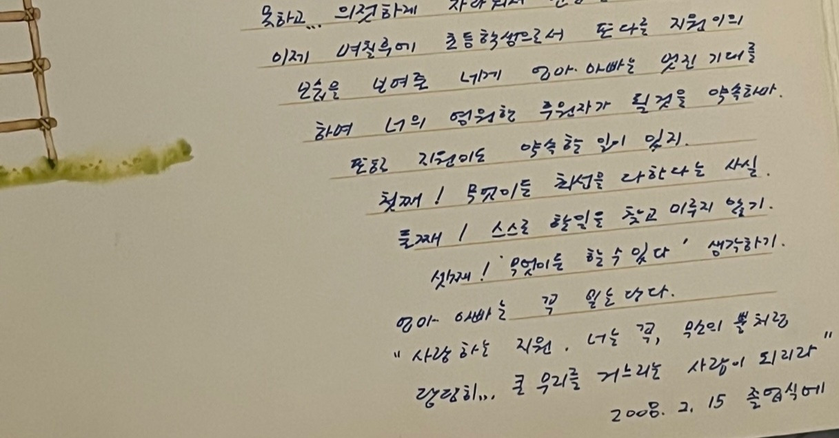 유치원 졸업하는 딸에게 보냈던 편지를 17년만에 다시 읽게 되었는데요, 그 내용을 보고 깜짝 놀랐습니다. ’무소의 뿔처럼 혼자서 가라‘ 라니요... 세상에나 이런 엄마가 있을까 싶어서 얼마나 황당하던지, 딸과 통화하던 중 너무 무안해서 다른 여자 이야기를 흉보듯 크게 웃었네요. 7살 어린아이에게 유치원 졸업축하 편지라고 하기에는 ’참 어렵다’ 싶었겠어요. 그리고 편지글은 또 왜 그렇게 길게 썼는지, 무슨 말이었는지나 알았냐고 물었더니, 그때는 아마 한글도 채 못 읽었을 거라고, 20살 때 우연히 발견해서 그때부터 종종 꺼내 읽기도 하고, 또 제게 편지 쓸 때 그 내용을 상기해서 쓰기도 한다고 말하는 딸!!