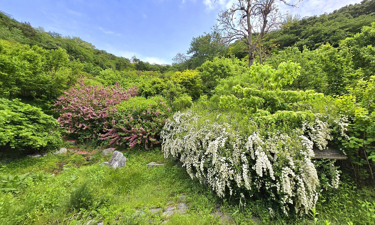 저의 정원, 월명산의 뒤쪽에, 아니 앞쪽일지도 모를 곳에서 또 새로운 산책길 하나를 발견했지요. 신기한 것은 두 곳 정도의 쉼터들이 있었는데, 어찌 알고 연인들이 선점하고 있는지~~~ 혹여 방해가 될까, 조심스레 마음은 후다닥 돌아 나왔네요. 거리에는 이미 저버린 조팝나무꽃이 아직도 청청히 탐스럽게 피어있고요, 분홍빛 병꽃나무꽃이 동백 떨어지는 듯한 자태를 준비하며 요염하게 반겼습니다. 그 밖에도 산딸나무, 층층나무 등, 아직도 월명의 봄꽃 나무들은 푸른 청춘으로 가기를 거부하며 어린양을 부리고 있는 형국이었네요.^^