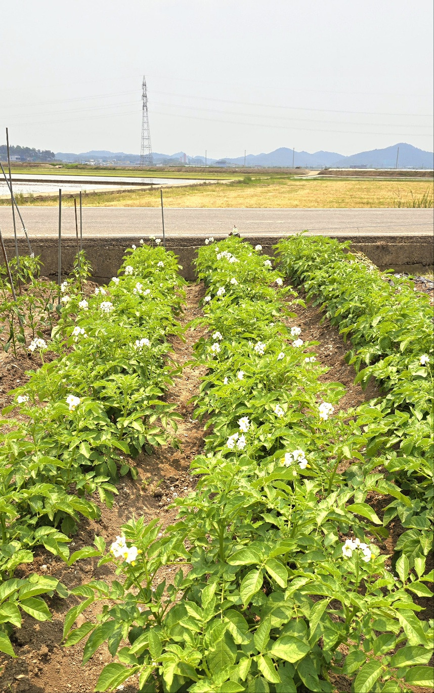 어느새 논에는 논물 가득, 어린 모들이 빼곡하네요. 보도블럭 땜질한 듯, 군데군데 남은 보리밭들이 보이는 제 텃밭에 서서 오래 살아온 노인처럼, 또 한 해를 당겨 생각해 보다가 돌아왔지요. 텃밭을 꽃밭으로 만들어 놓은 감자꽃, 오이꽃, 호박꽃, 고추꽃, 토마토꽃 등을 보면서 열매가 실하려면 꽃을 따야 된다 하지만, 저는 열매 한 알 덜 먹고 꽃이 저절로 시들 때까지 동거하는 것을 택했지요.