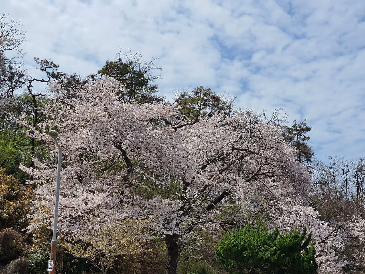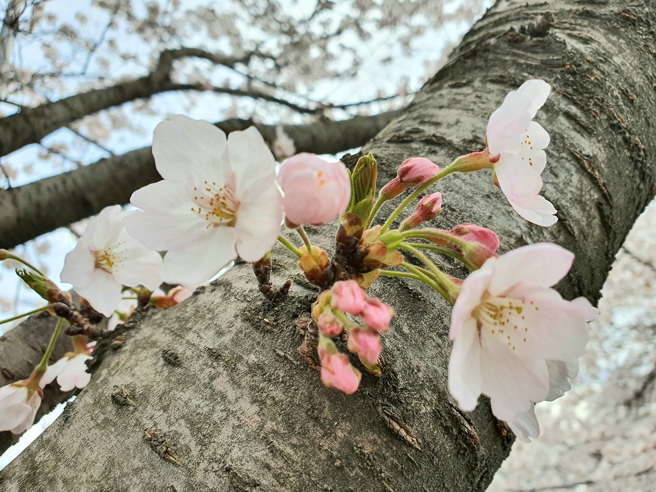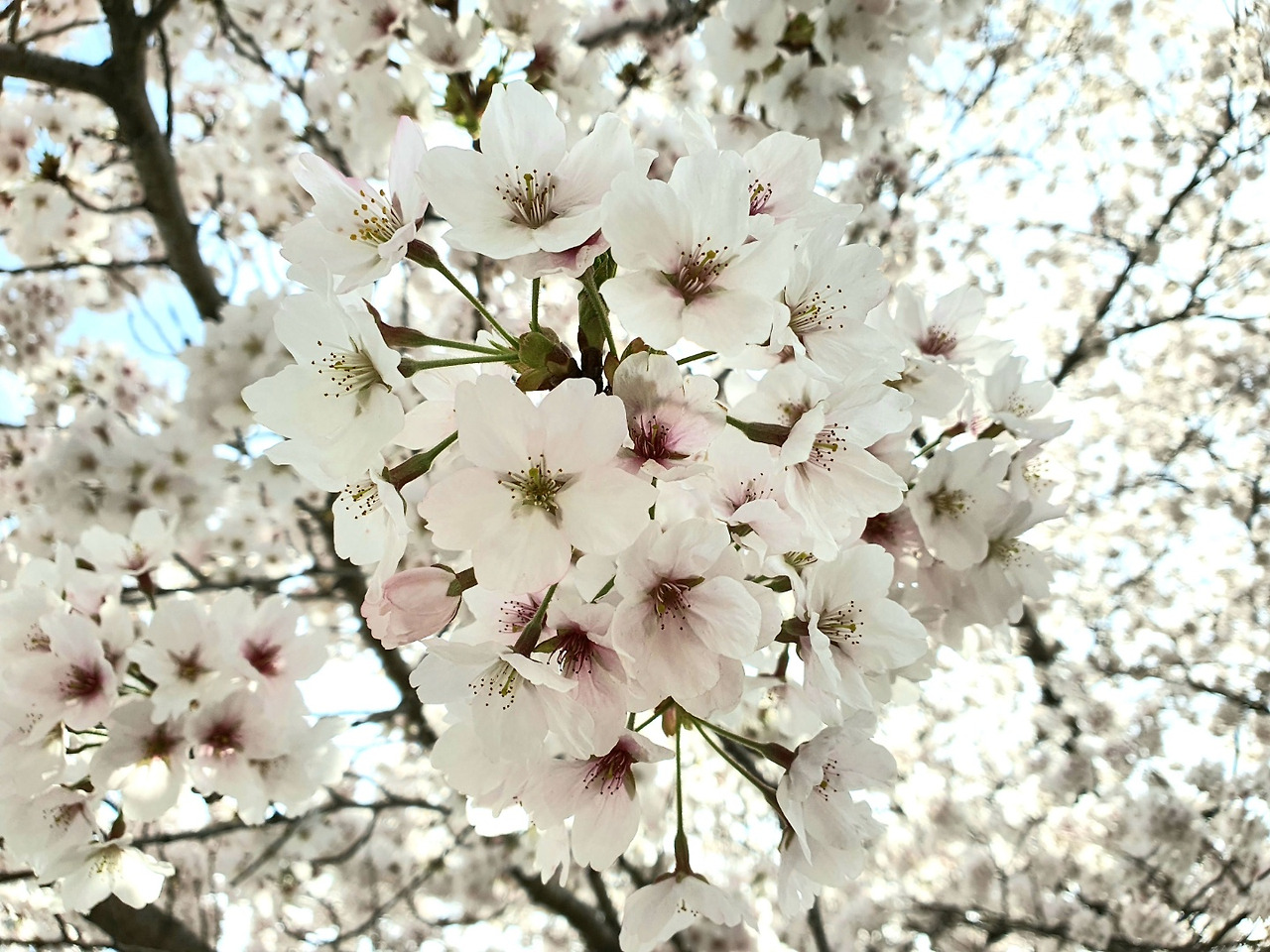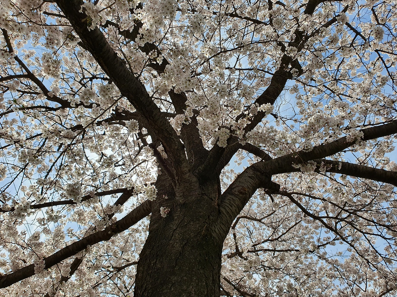 벚꽃을 바라보는 엄마의 상념어린 눈길에서 세월의 회한과 아버지에 대한 그리움이 묻어났다. 그사이 나는 벚나무의 이곳저곳을 사진에 담았다. 마침 푸른 하늘과 하얀 구름이 내려와 꽃잎에 앉으니, 나무 밑둥에서 위를 바라보는 카메라의 렌즈는 눈부신 자연의 아름다움에 눈을 감아버렸다.