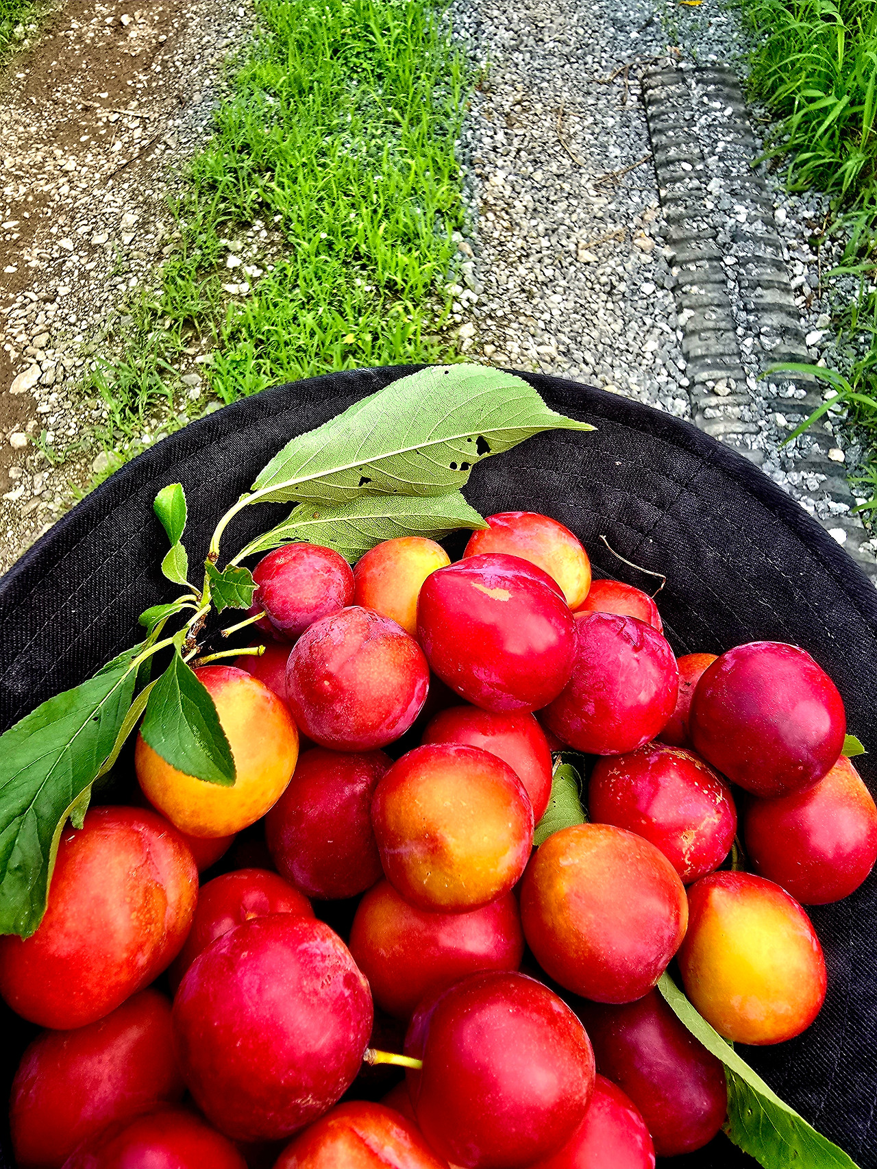 그 초록열매들 사이에 붉은 전구알을 가득 달고 서 있는 자두나무. 사다리가 보이길래, 흔들거리며 한 발 한 발 올라가서 자두를 모자에 담았습니다. 그러기를 몇 차례, 들고 갈 수 있을 만큼만 따야지, 내일 다시 와야지 했지요. 자두를 나눠 줄 사람도 떠올리고, 사다리 위에서 나무 위로 보이는 또 다른 세상지붕을 보는 재미는 그야말로 ‘순간이 천국’이었네요.