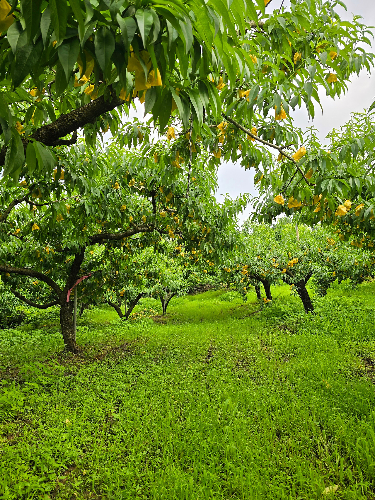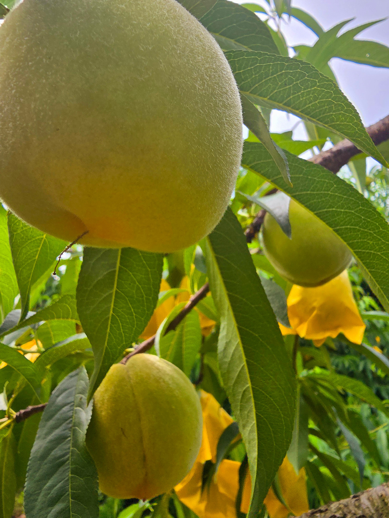 갑자기 어제 그 자두가 생각나서 과수원에 가고, 생전 처음 보는 푸른 복숭아 여름숲으로 가득해서 얼마나 싱싱해지던지요. 복숭아꽃 피었을 때, 꽃 사진 찍고, 가지마다 한 두 개의 꽃만 필요하다는 복숭아 생존법을 들은 지 두 달 정도밖에 안되었는데, 어느새 가지마다 털 복숭이 초록 복숭아들이 노란 적삼을 입은 모습으로 달려 있었습니다. 이미 다른 수종에서 첫 복숭아를 맛보았지만, 직접 복숭아 영그는 과정을 보는 것은 처음이었죠.