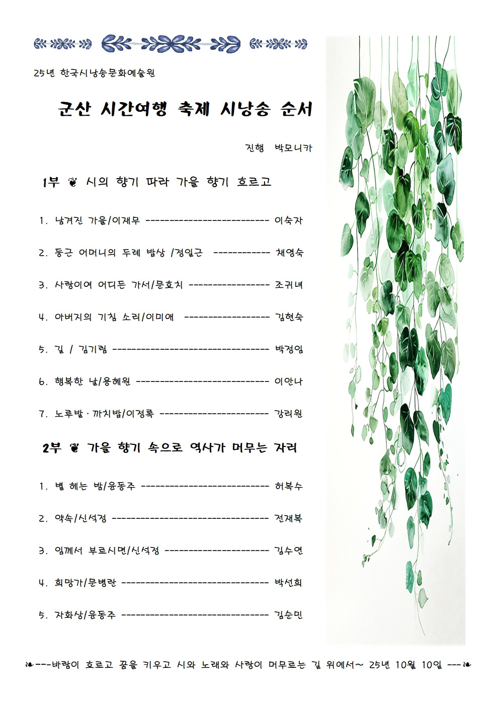 오늘은 시간여행축제 이튿날, 오후 1-2시에는 제가 속한 ‘한국시낭송예술원 군산지부’ 회원들께서 시낭송회를 하십니다. 군산 근대역사박물관 무대에서 하지요. 물론 저는 시낭송에 재주가 없어서, 대단하신 낭송가 님들을 소개하는 사회만 맡습니다. 총 12명의 낭송가님들이 나오셔서, 참으로 좋은 시를 낭송하십니다. 불타는 금요일, 게다가 추석명절의 연휴기간이니, 맛난 점심 드시고, 저희들의 시 낭송무대로 오세요. 함께 즐겨보시게요... 혹시 아나요?? 기분파인 제가 어떤 선물을 준비할지요^^