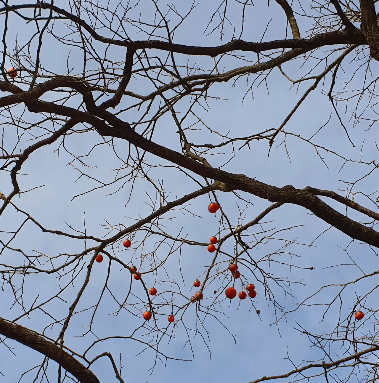 올해는 붉은 감이 풍년이라고 해요. 대봉감,단감,땡감들이 나무를 떠나 각자 가는 길은 다르지만 달콤한 선홍빛으로 누군가를 행복하게 했을거예요. 저도 과일 중에 감을 가장 좋아하지요. 감을 보면 저절로 발길이 멈추고 손길이 나가는데요. 무엇보다 누군가가 늘 떠오릅니다. 가수 나훈아는 엄마를 부르는 홍시. 저는 친정아버지를 추억하는 홍시처럼요. 요즘의 나무들이 제 옷 벗고 맨살을 보여주기 바쁜데요 감나무에 남은 붉은 빛은 부끄러운 미소를 보이는 홍조같아요. 우연히 작은 언덕길에서 만난 땡감나무, 하늘 향해 사진을 찍다가 살짝 흔드니 몇 개가 떨어졌어요. 다람쥐가 밤을 먹듯, 낙엽 위에 앉아 떨어져 터진 말랑거리는 감을 다섯 개나 먹었답니다. “역시 가을은 ‘감‘을 먹어야 ’감(느낌)‘을 잡지” 라며 혼자 중얼거렸지요. 참 달콤한 가을날의 조연으로 한참을 걸었습니다. 오늘의 시는 이준관 시인의 <감나무 한그루>입니다.
