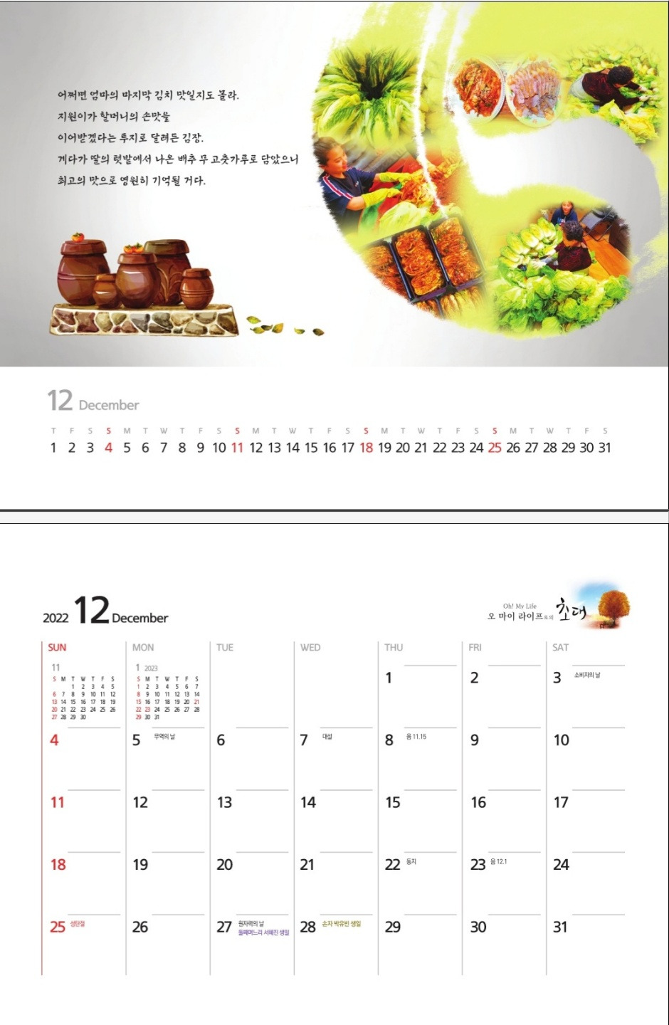 새해맞이 가족달력의 원고와 사진정리가 끝났네요. 2년전 저의 첫 에세이 출간시 기념으로 가족달력을 만들어볼까 했어요. 책의 내용이 부모와 형제에 대한 글이었거든요. 1년 12달 가족들의 생일과 제사를 기록하고 관련 사진과 시를 넣어 만들어서 형제에게 보여주니 엄청 좋아했어요. 일년동안 집안의 대소사를 서로 기억했어요. 작년에는 동생들이 먼저 만들어달라고, 올해 역시 ‘새해달력만들어봅시다’라며 사진을 보내왔네요. 바쁜 일상이었어도 달력에 들어갈 원고를 마감하고 인쇄소에 보냈네요. 달마다 만나는 가족들의 생일과 제사, 그들에게 보내는 시 한 수를 읽는 기쁨, 제가 먼저 다 누렸습니다. 제 막내동생(그의 나이 곧 50줄)이 담고 싶어하는 글은 ‘응답하라 1988중, 결국 가족이다’. 아픔도 슬픔도 보듬어줄 사람은 결국 가족이다 라고 써있군요. 혈연을 넘어 나의 모든 이웃이 가족이 되는 세상에 살고 싶은 사람들과 이 해를 보내고 저 해를 맞이하고 싶습니다. 오늘의 시는 진장춘시인의 <마지막달력>입니다. 봄날의산책 모니카