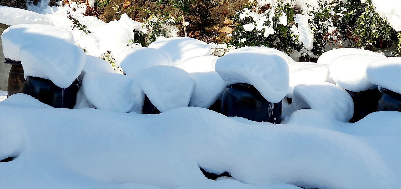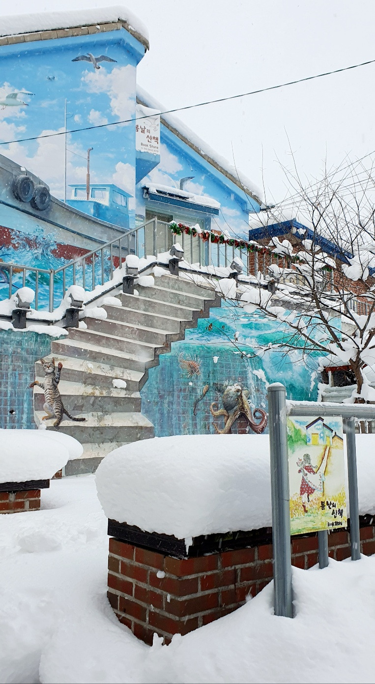 연이은 대설로 말랭이마을은 하얀 면사포를 쓴 천사들이 사는 천국 같았어요. 순백색의 빛을 담은 고깔모자를 쓰고 내려온 흰 나비천사들이 집집마다 내려앉았죠. 먼 나라로 설경을 보러가는 지인도 있었지만 저는 군산에서 아름다운 설경은 다 맛본 듯합니다. 그러나 현실과 이상은 언제나 엄청난 괴리가 있지요. 짜디짠 쓰디쓴 염화칼슘가루를 뿌려대니 한순간에 흰 눈과의 이별의 아픔을 감내해야 했습니다. 저도 어쩔 수 없이 커다란 청소도구 하나 들고 책방골목에 올랐죠. 아직도 반짝이는 흰 눈 영혼들과는 사진 한 장으로 안녕을 고했습니다. 책방으로 올라가는 계단에 쌓인 눈을 치우고 나니 이내 제 몸 구석구석이 쑤시며 아프더군요. 한여름의 더위처럼 온몸이 땀으로 적셨지만 책방 앞길은 트였어요. 크리스마스 이브, 누가 이곳까지 올라올까요. 그래도 책방을 열고 혼자서 캐롤송과 리스화환, 포인세티아 꽃, 그리고 성탄 시 몇 편과 놀았습니다. 저녁에는 성탄전야 미사에서 올해 제게 축복의 손길을 주신 모든 분들을 위해 기도했구요. 성탄은 빛으로 낮은 모습으로 우리에게 온 예수님을 축하하는 날이죠. 예수의 말씀이 들리시나요. ‘사랑하라. 네 이웃을!’ 폭설로 상심한 우리 이웃을 사랑하는 법. 바로 그들과 함께 집 앞 눈도 치우며 함께 땀을 흘려보는 것이지요.
