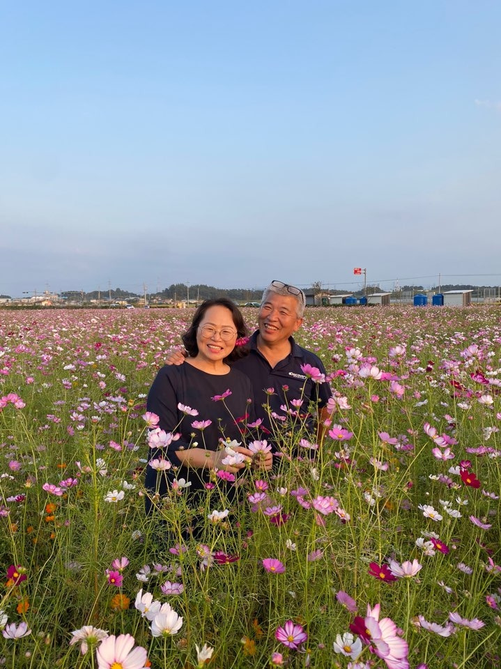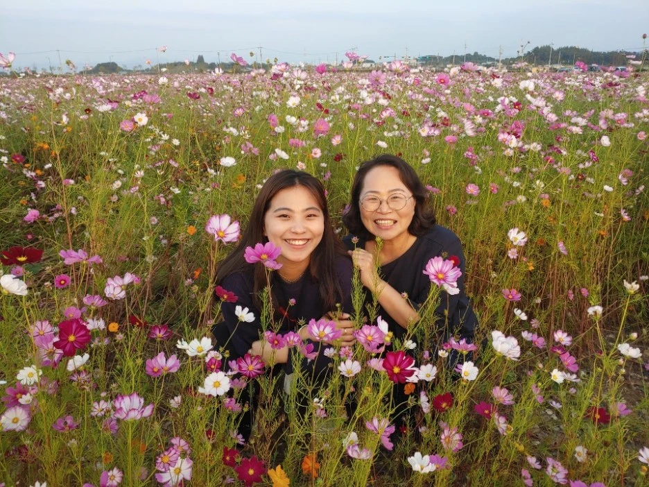 헬기는 눈에 안보이고 코스모스는 천지에 가득했어요. 큰 동서왈, 저기서 사진 찍는 사람들은 서울 촌놈들이라고. 딸과 저는 서울 촌놈이 되보기로 했어요. 꽃보다 더 예쁠 수는 없지만 꽃의 마음만을 닮고 싶어서였죠. 보너스로 아직은 빛이 덜한 황금 들판과 저녁 노을도 선물 받았구요.