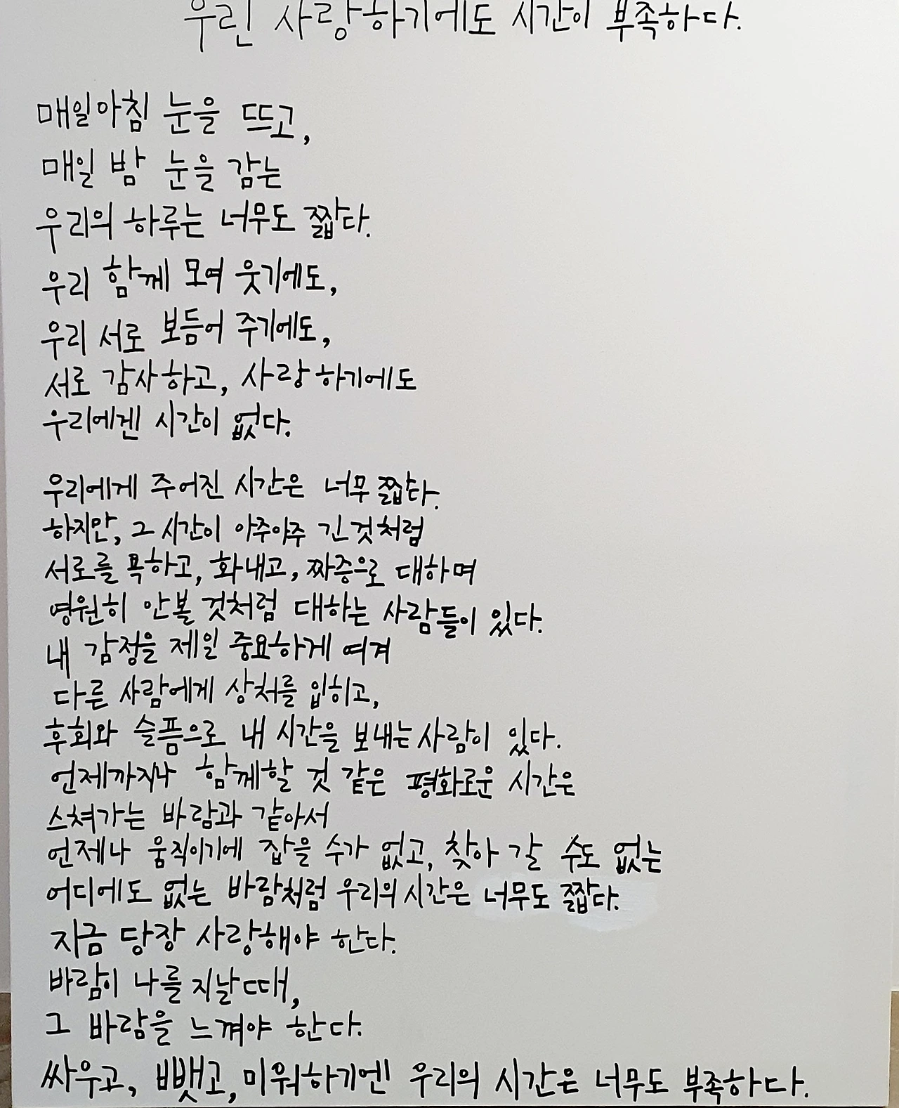 “꽃은 싸우지 않는다. 다 다른데 다른 색깔대로 살아간다고 어린이 그림화가가 말했잖어. 우리 말랭이 마을사람들도 꽃처럼 다르게, 하지만 예쁘게 살거여. 글도 배우고 그림도 그리면서. 문화라는 것이 뭔지 쪼금은 알 것 같고만. 제주에 와서 90대 할망그림, 어린 형제들 그림, 옛날 사람 추사 글과 그림 봉게, 우리 마을에서 할려고 하는 글방공부가 뭔지 궁금하고 무엇이든 잘할 것 같어. 함께 와줘서 고마워~~잉”