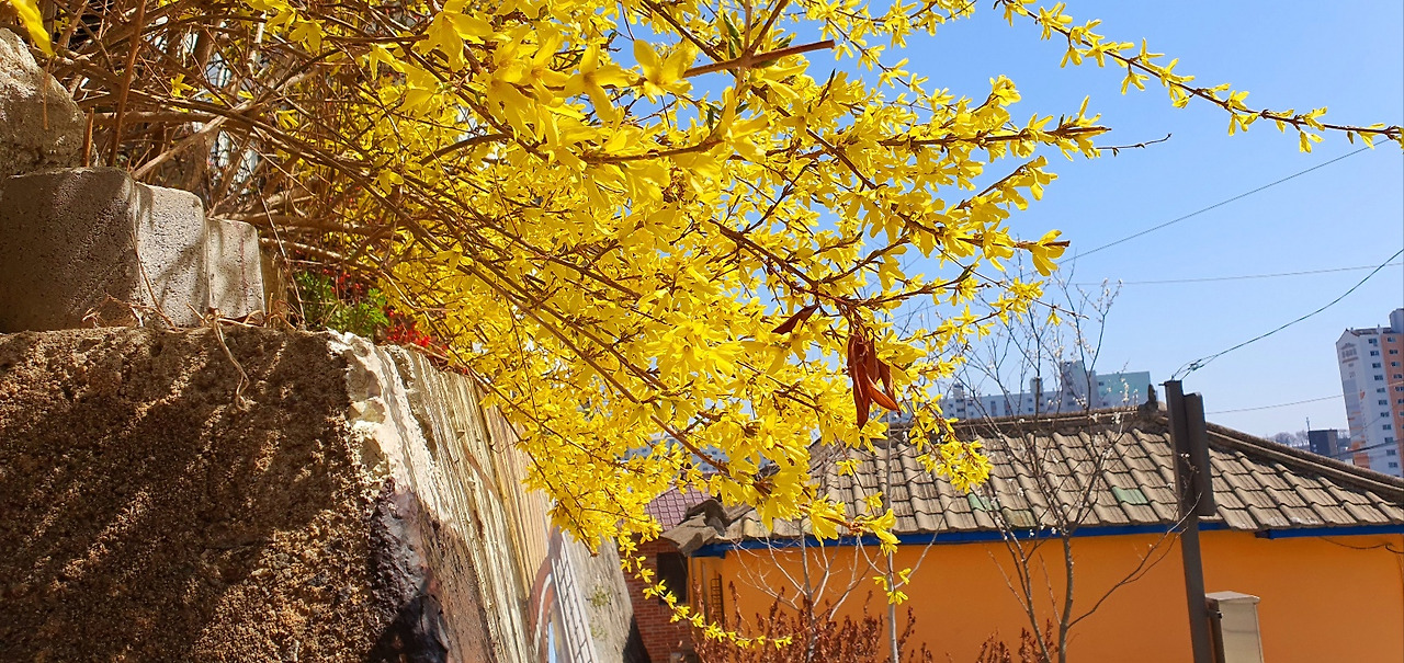 머리맡에 놓은 찐 개나리 번들이 저의 새벽을 밝힙니다. 금주 간은 어딜가나 나리나리 개나리 천국이네요. ’이쁜 딸 입술 같은 개나리‘라고 어느 시인은 말했지만 제 눈에는 노란 병아리 두 마리가 서로 머리를 맞대고 하늘 향해 자유를 외치는 모습입니다. 그러고 보니 개나리는 향기가 없어요. 매화꽃은 봉우리 하나만 있어도 은은한 향기가 방안을 채웠었는데요. 하지만 태양빛의 향기가 온 사방에 널려있으니 아무리 바빠도 눈길한번 사진한번 찍어보시길 바래요. 오늘은 말랭이마을을 소개하는 모 방송에 출연해요. 사전 질문지를 읽어보니 어느덧 말랭이가 많은 사람의 입과 귀에 오르내리고 있구나 싶었어요. 가보고 싶은 곳으로 손꼽힌다니 괜스레 저도 책임감을 느끼구요. 어제도 마을행사 후의 이모저모를 살피는 미팅이 있었는데요, 제 집살림하는 이의 손길처럼 모두 한마음으로 마을을 챙겼죠. 작가들도 시 관계자도 마을사람들 못지않게 주인의식으로 살고있는 거지요. 어제 점심 후 산책길로 가까이 있는 한산모시관에 갔어요, 때마침 모시짜기 명인이 베틀작업을 하고 있어서 말로만 표현하는 날줄(세로줄)과 씨줄(가로줄)의 교합을 보며 어르신과 담소를 나눴네요. 베 한필을 만드는데 최소 2주 이상, 앉아서 좌우로 모시줄이 담긴 북을 얼마나 많이 옮겨야 할까요. 날줄씨줄이 만들어줄 무한한 믿음의 교차가 있어야 곱고 고운 모시 베 한 필이 나오더군요. 말랭이 마을 세상그물도 그 이치를 담고 짜여지고 있습니다. 오늘은 김병훈시인의 <내 봄에는 너만 피더라>입니다. 봄날의 산책 모니카.