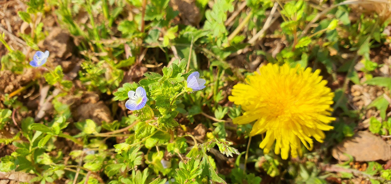 어느 시인의 앞마당에 들어서니 보랏빛 봄까치꽃(개불알꽃)이 가득했어요. 앞장서 내딛던 오른발이 주춤거리며 절로 뒤꿈치가 들어지더군요. 세심히 위아래, 좌우를 바라보니 수선화, 민들레, 동백꽃, 이름모를 풀들이 살랑거리데요. ’地不長無名之草(지불장무명지초)-땅은 이름 없는 풀을 기르지 않는다‘라고 했는데 땅에서 솟아나는 풀들의 이름을 다 알지 못하여 불러주지 못해 미안한 마음도 들었구요. 다행히도 제 곁에는 자칭 식물박사 한 분이 있어 도움을 받죠. 요즘은 검색하면 다 나온다는데, 전 여전히 아날로그라 사진을 찍어 그분께 물어봅니다. 벌써 오늘이 삼월의 끝 날이네요. 새봄을 알리는 신호가 세상의 오감을 타고 퍼져 나가더니 사람들에게도 자연의 신비로운 붓질로 오감도를 새겨놓았죠. 제 몸에도 기이한 문양들로 삼월의 봄이 새겨져 있습니다. 아마 부지런히 뛰어다닌 발 따라 구불구불 ’나의 길‘이 만들어져 있을거예요. 마지막 삼월새벽이 말해주네요. ’봄의 대문을 활짝 열었으니 이제 저 너른 사월의 꽃밭과 풀밭으로 뛰어나가 놀아라‘ 라구요. 한 점이 있어야 선 하나, 면 하나가 있듯이, 삼월의 마지막 한 점으로 이어지는 사월의 선과 면을 그려봅니다. 하늘과 땅 사이에 ’내’가 있어서 아름다운 세상도 꿈꿉니다. 동시에 내 삶의 순간을 놓치지 않으려는 조급함보다는 오히려 순간의 품자락을 펼쳐주어 더 넓은 순간의 공간을 만드는 오늘이길 바래봅니다.