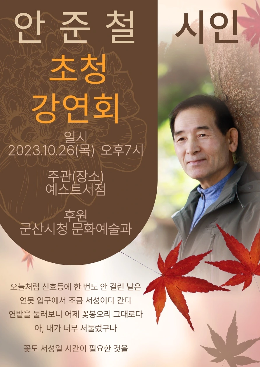 연꽃과 가을의 교환은 최대교역이라고 말한 시인의 말에 ’정말일까‘라고 의구심을 가졌었죠. 그런데 말이죠, 어제는 그 무역현장에서 제가 가장 큰 수혜자가 되었습니다. 바로 글쓰기 문우, 강 선생님께서 저를 위해 연잎밥을 만들어오셨지요. 여름날 푸르름은 가을날 농익은 갈색 얼굴로 식탁 위에 앉아서 우리들을 기다렸지요. 감탄소리와 함께 사각보자기를 한 겹 한 겹 펼쳐보니 연근, 밤, 대추, 은행, 호박을 안은 붉고 찰진 밥알이 있었어요. 여수에서 올라온 돌산 갓김치를 가져왔다고 미리 전갈을 받았기에 그 반찬만으로도 꼬르륵 소리를 감내하고 있었는데요,,, 부처의 자비로운 미소같은 연잎밥이라니요. 참으로 송구하고 고마워서 절로 고개숙인 벼 이삭이 되어 기도했네요. 글을 쓰고 서로 글에 대한 평을 나누는 시간만으로도 행복하지만, 역시나 밥 나눠 먹는 일처럼 최상의 만찬은 없더군요. 돌아와 책상 앞에 있던 시집을 다시 한번 펼쳤네요. 안준철 시인의 시집입니다. 이 속에 담겨진 말 ’ 연꽃과 가을의 교환은 최대교역‘이 눈에 들어온 거죠. 목요일(10.26. 저녁 7시) 작가특강 시간에 바로 안준철 시인이 오십니다. 집 앞 덕진공원에 피어나는 연꽃을 여섯 해 동안 보면서 탄생한 시집입니다. 아직 만나 뵙지 못했지만, 한 가지 소재, 연꽃 하나로 75편의 시를 담은 작가의 필력과 감성에 미리 반했습니다. 오늘 미리 그의 시 두편, <꽃도 서성일 시간이 필요하다> <도둑과 장물>를 소개하고 싶습니다. 봄날의 산책 모니카