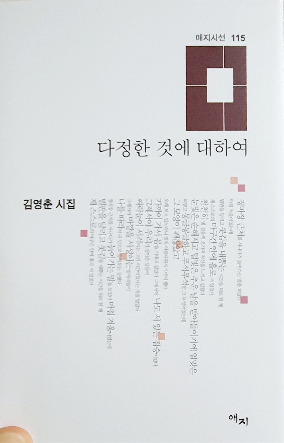 연꽃시인의 맑고 밝은 미소를 보았다면 사군자 ’매난국죽‘이라도 제자리를 양보했을걸? 할 정도로 진실한 사람, 안준철시인과 만난 가을저녁은 강연에 참석한 모든이의 마음에 연꽃을 피웠습니다. 아마도 그들의 꿈속에서 만개하였다가 물고기에게 수유하는 아름다운 소멸에 이르도록 향기가 가득했을겁니다. 맛있는 시와 마음을 들려주신 시인께 감사드립니다. 돌아와 이런저런 느낌을 메모한 후 시인께서 추천한 또 다른 시집을 펼쳤습니다. 제목이 하도 다정하여, 또 시집의 작가 미소 역시 다정하여 후다닥 ’시인의 말‘을 읽었답니다. -버릴 수 없으니 품고 가게 되었다. 버릴 수 없었으니 별것도 아닌 것처럼 덤덤하게 적어 갔으면 한다.- 시인이란 매일보던 것도, 하찮게 여겨지는 것도 새롭게 봐야 한다고 하더니, 첫 시 <손목>을 통해 내 손목을 다시 바라보며 그 말의 뜻을 알았습니다. <산책>을 읽으며 ’가을은 조선의 바깥으로까지 길을 낼 수 있음‘에 고개를 끄덕였습니다. 어쩌다보니 시집 한권, 60여편의 시를 읽었네요. 보여진 여러 갈래 길에 점 하나씩 찍고 돌아다니다 언제 잠이 들었을까요. 일어나니 새벽 네 시가 살짝 넘었더군요. 할 일이 있어 다섯시 알람으로 맞췄었는데 시 하나를 의식하며 잠든 탓에 더 일찍 일어났나봐요. <세 시나 네 시쯤>에는 제 마음을 대신 해준 싯구들이 많았거든요. 김영춘 시인의 세 번째 시집 <다정한 것에 대하여>에 들어있는 대부분의 시들에게서 ’오호!‘라는 감탄사가 그려진 낙엽들이 당신 발 끝에 떨어질 것입니다. 밟고 지나가지 마시고 꼭 주워서 낙엽 책갈피처럼 끼워두시면 어떨까요...발문에서 복효근시인은 ’생의 가을이 연주하는 다정 변주곡‘이라고 하셨네요. 언젠가 김 시인도 직접 만날 인연이 있겠지 생각하며 오늘의 시를 들려드립니다. 이제 막 부화한(10.10 초판) 시집이니 꼭 읽어보시고 시인의 따뜻한 시선과 사유를 널리 나누시게요. 봄날의 산책 모니카
