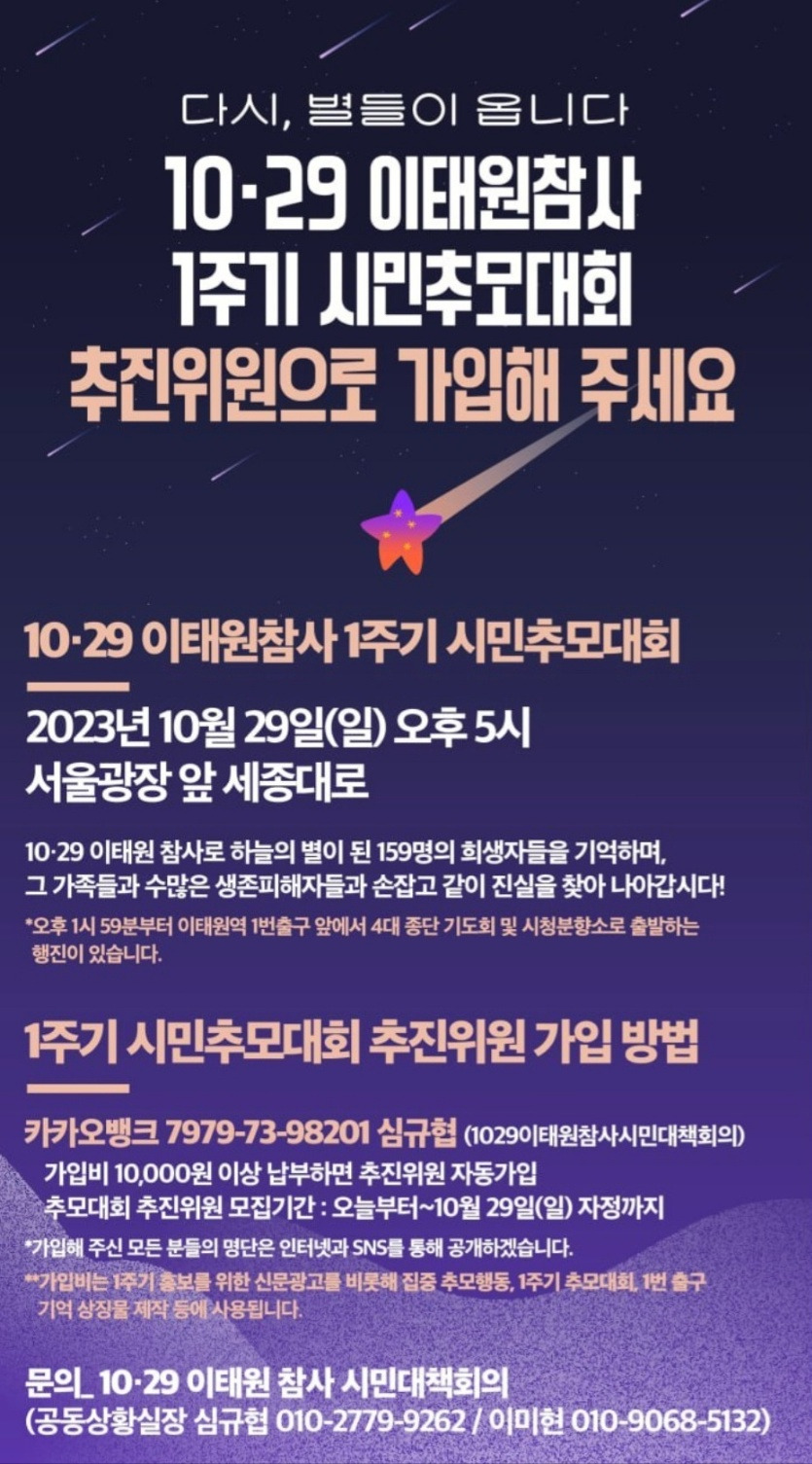 당신의 이름이 불리워지지 않는 날의 슬픔. 아니 누군가가 강제로 당신의 이름을 어둠 속에 가둬버린 아픔을 생각해본 적이 있으신가요. 오늘은 이태원참사 1주기일입니다. 159명의 사랑하는 사람들이 영육간의 영원한 이별이 있었습니다. 곡진한 애도가 넘쳐 흘러도 슬픔과 아픔이 사라질 수 없건만, 이 나라 역사상 합동분향소 최초로 무명으로 남겨진, 위패도 없는 장례식. 1년이 되었건만 희생자를 위해 정부는 아무런 대답이 없습니다. 20대인 제 아이들의 세대들이 세월호 희생으로 하늘나라의 별이 된 후, 전 국민이 가슴에 푸른 멍을 안고 살아가지요. 그런데 지워지지 않은 흉터 위에 또다시 깊은 상처로 그어진 이태원참사. 아직도 그날의 그 현장이 생생합니다. 세월호 희생자 분향소에 찾았을 때 ‘다시는 이런 일이 일어나지 않기를...’이라고 두 손 모았었지요. 또다시 너무도 가까이, 내 아들 딸도 언제든지 갈 수 있었던 그 흔한 거리에서 일어난 믿지 못할 엄청난 사고. ‘도대체 왜!’ 라며 묻고 싶은 말은 많으나 오늘은 가슴 무겁게 내려오는 슬픔을 모아 희생자와 그 가족들만을 위해서 애도하고 싶습니다. 그리고 분향소 하나도 제대로 제공하지 않는 현 정권의 무도함에 항거하는 맘으로 다음 포스터에 동참하셔도 좋겠다 싶습니다. 타인의 아픔에 공감하는 능력은 우리가 반드시 익혀야 할 최상의 배움입니다. 글과 시를 사랑하는 지성인으로서 사는 당신께서 보여줄 아름다운 실천입니다. 특별히 오늘의 시는 이문재 시인이 이태원 희생자를 위해서 쓴 시 <이제야 꽃을 든다>를 들려드립니다.
