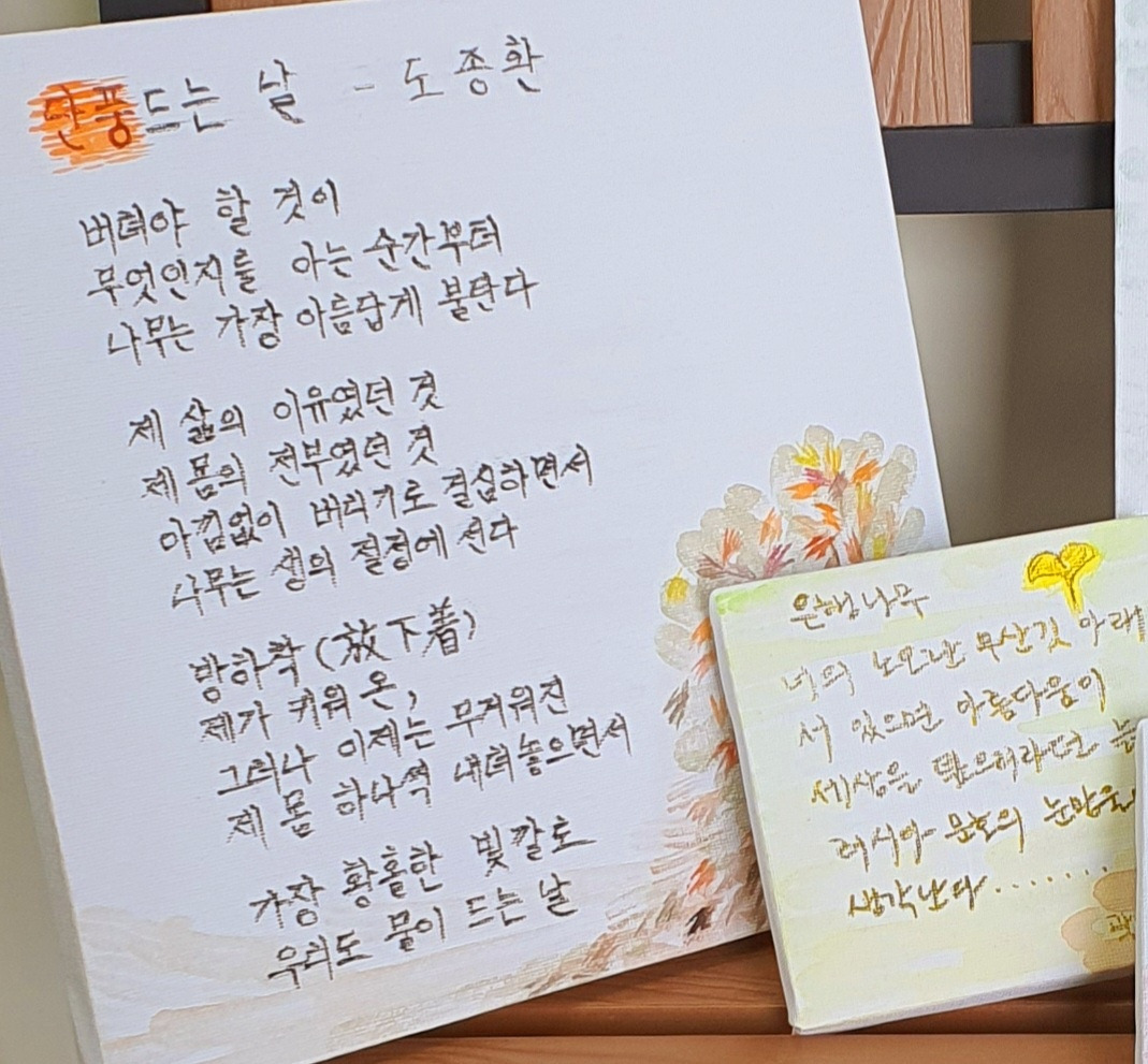 누구나 능력있는 사람이 되고 싶어하지요. 선천성 능력, 힉생 때 학력을 포함하여 태어나서 죽을 때까지 자신이 가진 능력이 궁금하고 다 쓰고 갈 수 있기를 바라지요. 우리는 흔히 학력을 기준으로 자기의 능력을 평가받습니다. 길게 산 것은 아니지만 이 기준처럼 우매한 것은 없는 듯 합니다. 박사가 될수록 능력은 제한받구요. 죽는 날까지, 아니 어쩌면 그 이후에도 사람의 능력은 지속되고 평가받을 수 있다고 생각하니까요. 어제는 추운 날씨 덕분에 말랭이 잔치마당이 여느 달보다는 한산했어요. 에너자이저로 알고 있는 제가 기운이 없을까 봐 일부러 찾아와 주신 지인들마저 없었더라면 진짜 텅 빈 하루를 보냈을지도 모르지요. 일찍 하산하여 몇 줄을 쓰고 있는 와중, 저녁에 만난 또 다른 지인들의 대화를 통해서 인간의 다양한 능력을 바라볼 볼 시간이 있었답니다. 지금 이 나이에 만약 제가 학생 때의 학력으로, 또 그 능력을 바탕으로 저의 삶이 재단된다면 참 슬픈일이겠다 하는 생각을 했지요. 누구나 타고난 그릇이 다른 모양일 뿐입니다. 어느 한순간도 남과 비교할 필요도 비교당할 필요도 없는 것이 인간고유의 가치이지요. 그럼 어떻게 하면 자신이 가지고 있는 숨겨진 잠재능력을 조금이라도 수면 위로 끌어올릴까요. 누군가의 칭찬은 순간의 달콤한 곶감, 자신의 자긍심만이 진정한 자기능력의 돛대이자 방향키입니다. 잠들기 전 잠시 읽었던 <거인의 노트, 김익환 저>에서 말한 ‘기록과 메모’는 ‘인간의 생각’만큼이나 중요한 능력 도구인듯합니다. ‘단 한 줄의 글‘이 당신의 평범한 일상을 변화시켜준다면... 당신의 잠재능력을 볼 수 있다면.... 한번 해 볼만한 즐거운 일이 아닐까요^^ 도종환시인의 <단풍드는 날>입니다. 봄날의 산책 모니카
