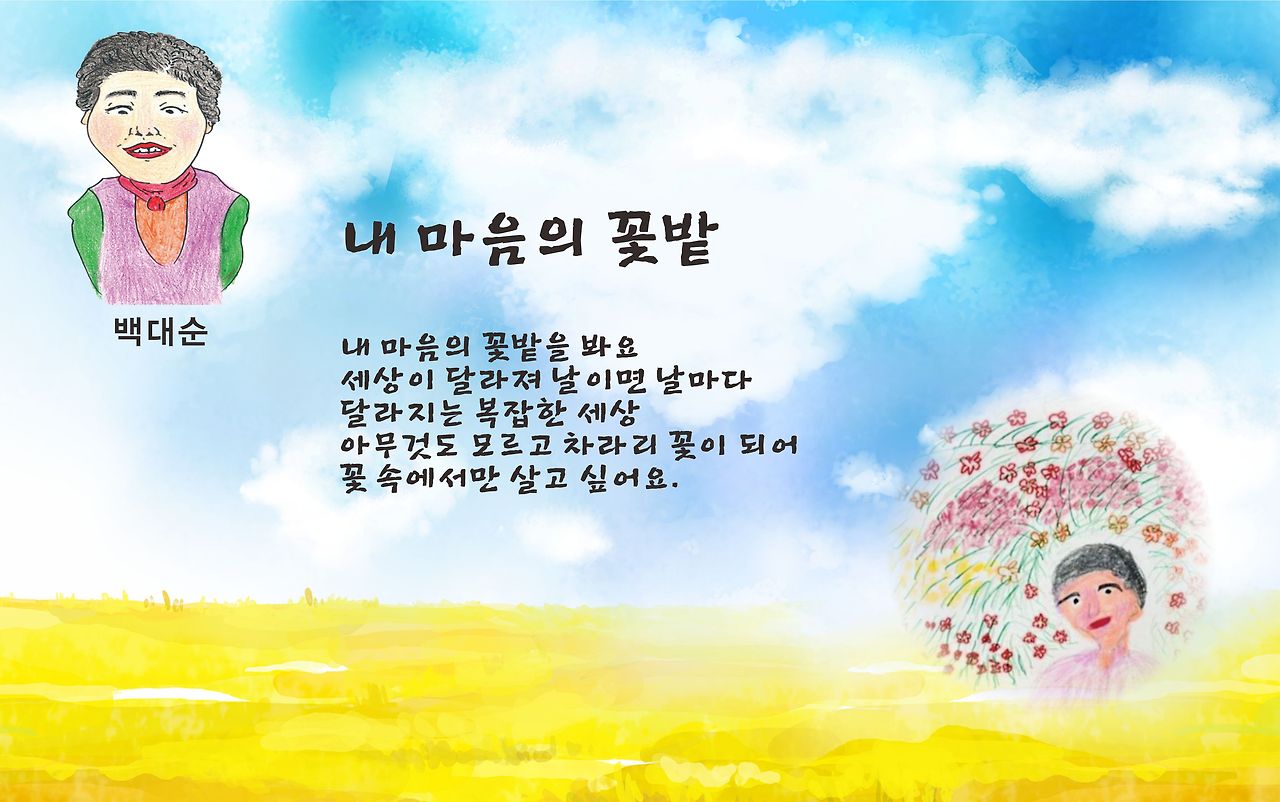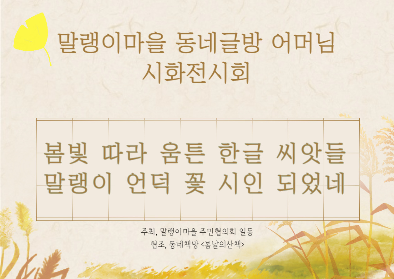 “약속을 지켰습니다. 나오셔서 어머님들 시화전 보세요.” 우르르 말랭이 어머님들이 나오셔서 당신들의 작품을 찾아 두리번거렸지요. 10개월간 함께 했던 동네글방의 하이라이트, ’말랭이 어머님 시화전시회‘를 위한 인쇄용 플래카드를 난간마다 걸었습니다. 총20 작품입니다. 끝까지 책임을 진다는 것은 진정 무엇이었는지... 강박에 가까우리만치 책임감에 사로잡히는 이 성격 덕분에 동네글방을 드디어 마무리합니다. 오늘 말랭이 골목잔치 마지막 날, 마을에 오는 방문객들에게 보여주고 싶었습니다. 여기사는 분들이 시를 쓰고 그림을 그려서 이렇게 훌륭한 작품들을 전시했으니, 꼭 읽어보시라고요! 골목길 따라 플래카드를 다 걸고 어머님들과 기념사진도 찍고 나니, 새해에도 말랭이 입주작가로서 계속 거주할 수 있다는 전화도 받았습니다. 2024-2025 입주작가를 위한 공모전에 재도전, 최종결과가 나온거지요. 사실 공모를 앞두고 많은 고민을 했지요. 조금 더 큰 책방을 꾸려나가야 하는 가를 두고서요. 이곳에서의 책방 삶이 그만큼 즐거워서, 3평을 벗어난 다른 장소를 희망했지요. 결론은 이 모습으로 앞으로 2년동안 더 거주할 듯합니다. 하지만 제 마음은 늘 어느날 문득 휘몰아 나오는 돌개바람과 친해지고 싶은 구름. 그사이 또 어떻게 달라질지 저도 모릅니다. 오늘은 말랭이마을 축제 올해 마지막 시간이네요. 자랑하고 싶은 것은 오로지 시화전이니, 혹여라도 시간이 되신다면 오셔서 구경해보세요. 말랭이 어머님들 시 몇 편 들려 드릴께요. 봄날의 산책 모니카