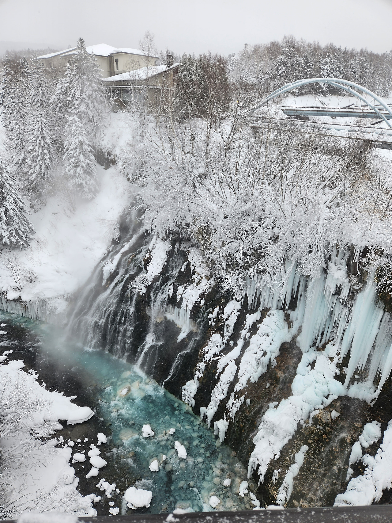 시로가네온천에 위치한 흰수염폭포. 겨울에도 얼지 않고 에메랄드빛 물줄기가 흐른다.