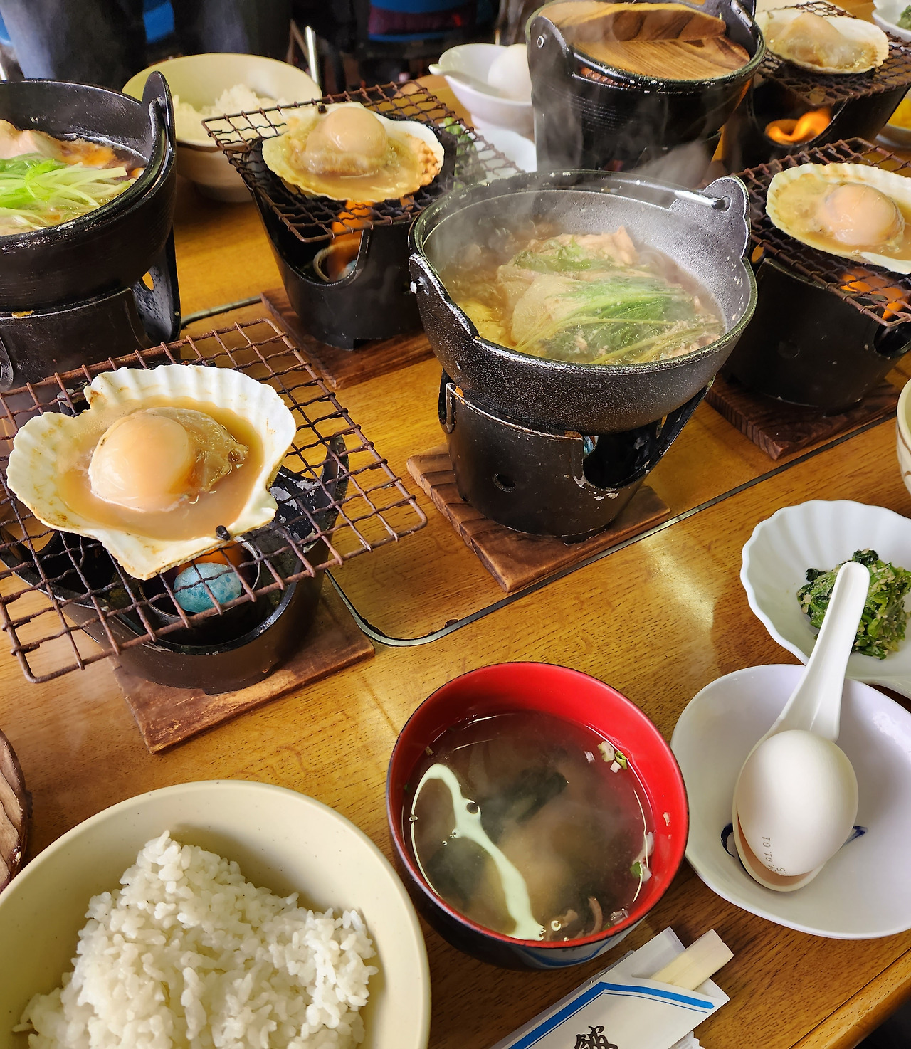 간장 베이스의 일본 라멘과 일본식 전골 스키야키가 있는 밥상