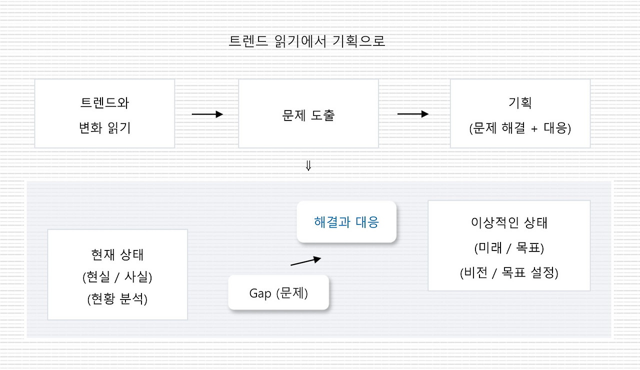 정리하면 기획의 출발은 ‘문제’가 무엇인지를 정의하는 것이다. 기획의 목적이 바로 '문제의 해결과 대응'이기 때문이다. 트렌드 읽기는 겉으로 드러난 현상에서 안에 담긴 의미를 파악하고, 문제의 원인과 성격을 분석하는 작업이다.