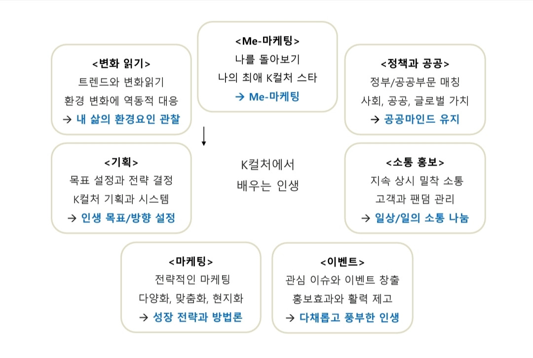K컬처를 분야별로 나눠보면 변화 읽기와 기획부터, 마케팅, 홍보, 이벤트, 정책까지 우리의 일상과 삶의 여정에 시사하는 바가 많다. 우리 인생의 길잡이가 될 다양한 전략과 방법론을 확인할 수 있다. 시대 변화를 읽고 방향을 설정하는 기획단계부터, 소통과 공공 마인드의 유지까지 그 내용은 다채롭고 유익하다. Me-마케팅을 통해서는 나를 돌아보고 최애 K컬처 스타를 살펴보면서 고객과 소통하는 나만의 정체성을 고민해 보는 계기가 될 수 있다.
