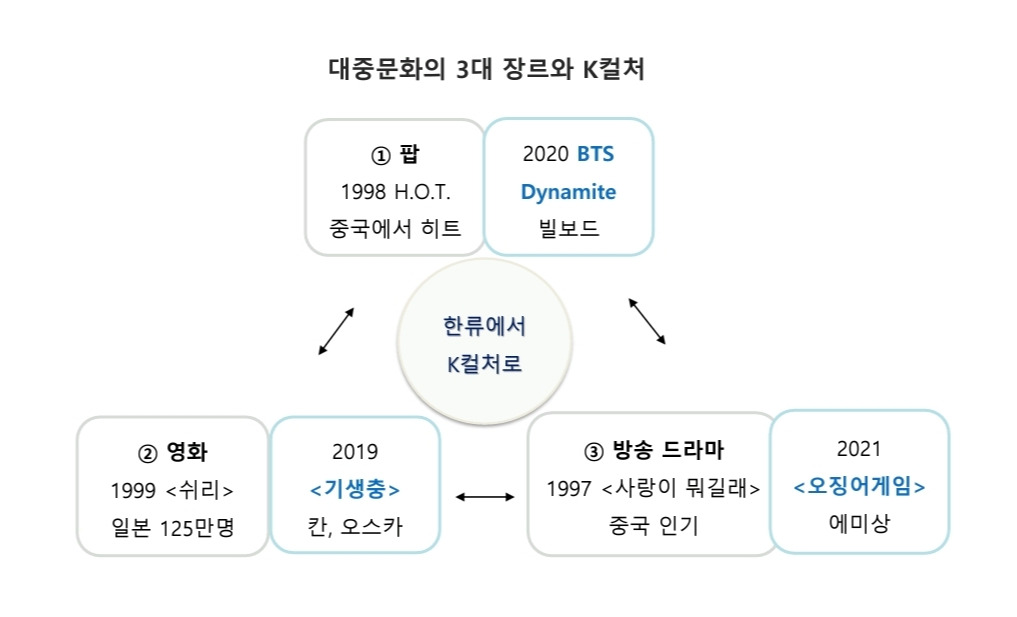 K컬처 붐을 앞장서 이끈 건 대중문화의 3대 장르로 일컬어지는 음악, 영화, 드라마다. 누구나 쉽게 빠져들고 문턱 없이 공감하는 분야다. 한류 태동 이후 20여 년 만인 2020년 무렵 화려한 스포트라이트 속에 세계 무대의 공인을 받았다. 빠른 시대 변화와 거센 개방의 파고 등 위기와 도전을 이겨내고 이뤄낸 성과다.