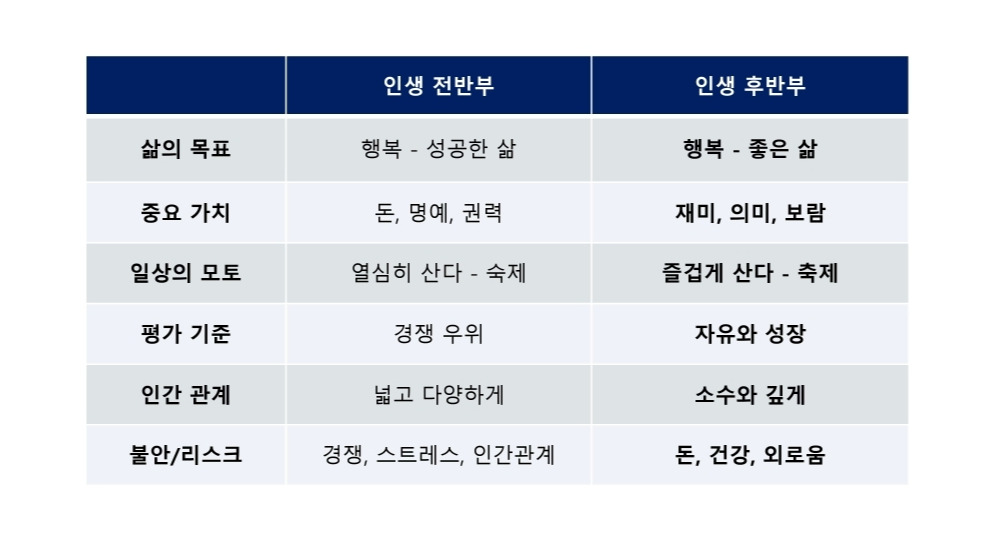 현역과 예비역, 직장인과 자유인의 삶은 크게 달라진다. 현역이 경주나 게임을 수행하는 것처럼 경쟁과 긴장 속에서 생활한다면, 예비역은 여행하듯이, 축제에 참가하듯이 여유와 자유의 시간을 즐긴다. 누구나 삶의 목표는 행복이지만, 행복을 구성하는 요소는 생애 주기에 따라 다르다. 전반부에는 돈이나 명예, 권력이 중요하다면, 나이가 들면 재미와 의미, 보람이 중심이 된다. 전반부 인생과 후반부 인생을 단순화해 비교하면 다음과 같다.