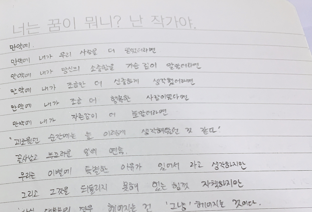 중학교 시절, 매번 수업마다 50자 글쓰기를 했던 국어 선생님이 있었다. 나는 선생님을 감동시키기 위해 50자 안에 내 안의 모든 감성을 꾹꾹 담았다.(선생님이 예뻤다는 건 부정하지 않는다.) 수단과 방법을 가리지 않고 선생님을 웃기거나 감동을 줄 수 있는 글을 써야 했다. 그 날 선생님이 내 글을 보고 ‘큭큭’ 웃는 날이면 ‘성공’이었고 내 ‘감성’을 알아본 날이면 ‘대성공’이었다.