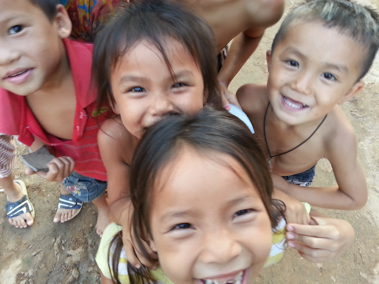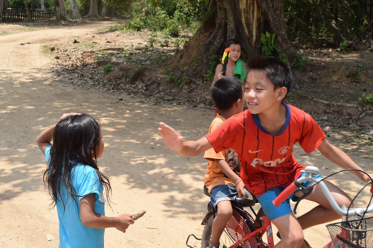 이 여행이 오래도록 기억에 남는 이유는 단연 마을 아이들 때문이었다. 외국인을 거의 본 적 없는 이 오지의 아이들에게 혼자온 여행자는 그 자체로 호기심의 대상이었다. 처음 만난 건 한낮의 폭염 속 냇가였다. 동굴 너머의 넓은 강과는 달리 이곳엔 작은 시냇가만 있었고, 폭염에 물은 미지근한 흙탕물이었지만 이 물이라도 없으면 견딜 수가 없었다. 몸을 담그고 있을 때 동네 아이들이 하나둘 관심을 보이며 근처로 모여들었다.