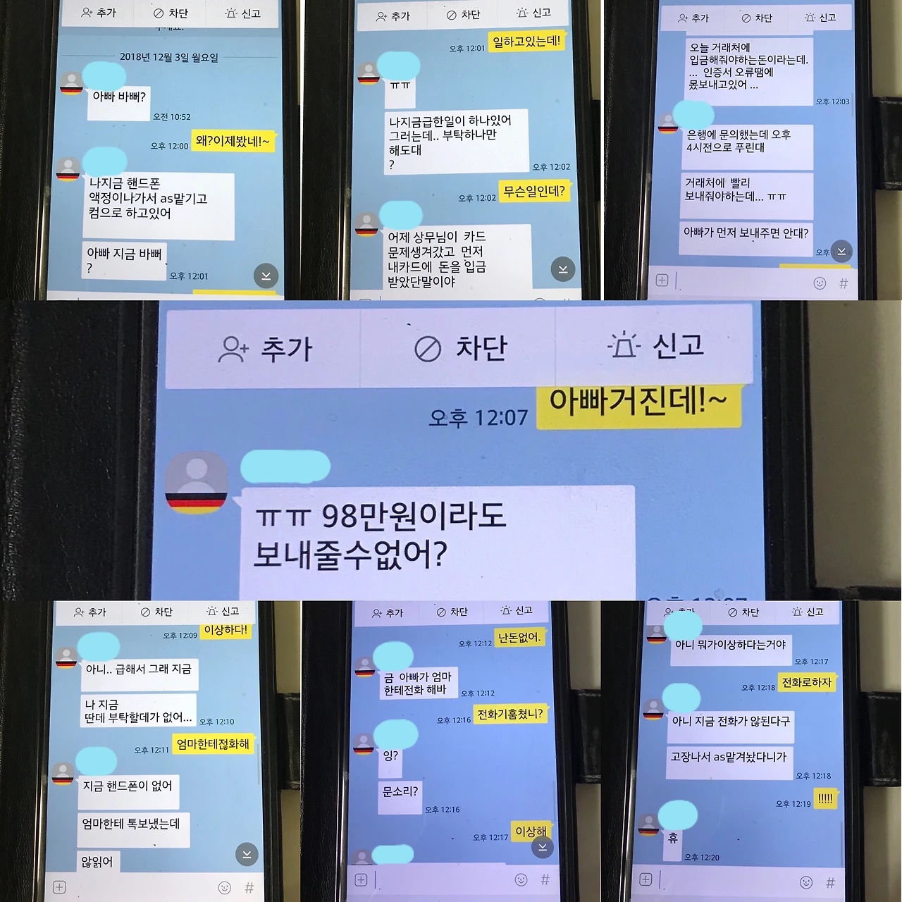 “니 이름으로 아빠 휴대폰에 돈을 보내달라는 카톡이 왔는데 아무래도 보이스 피싱인 것 같아. 아빠는 ‘큰 딸’로 니 번호를 저장해 놨는데 실명으로 연락이 왔고, 상무님 핑계를 대는 게 보이스피싱이다 싶더라고” (나는 회사원이 아니다.)