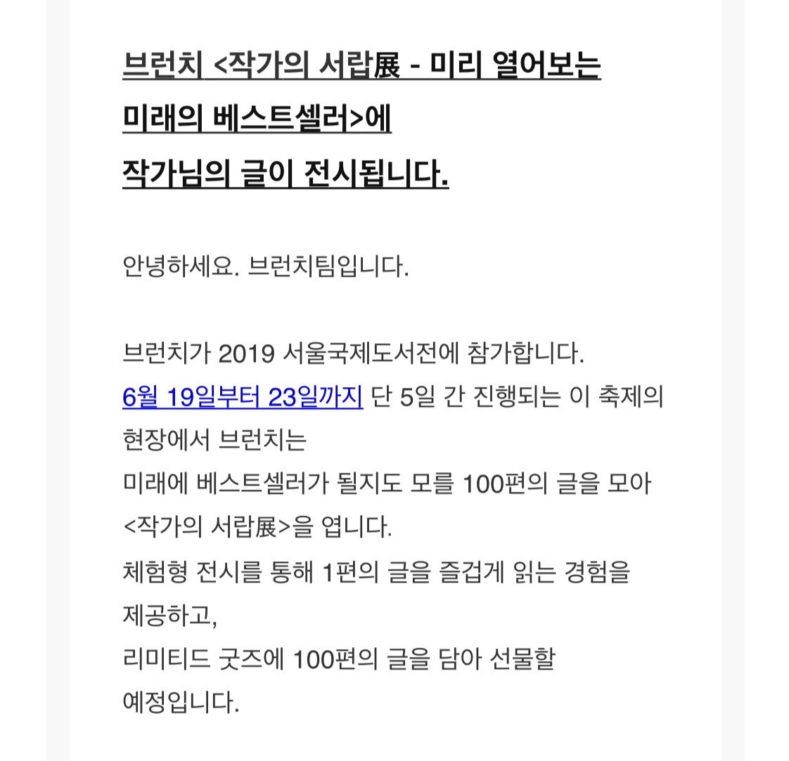 2019 서울 국제도서전에 브런치가 “작가의 서랍전”으로 참여한다는 소식은 다들 들으셨죠?