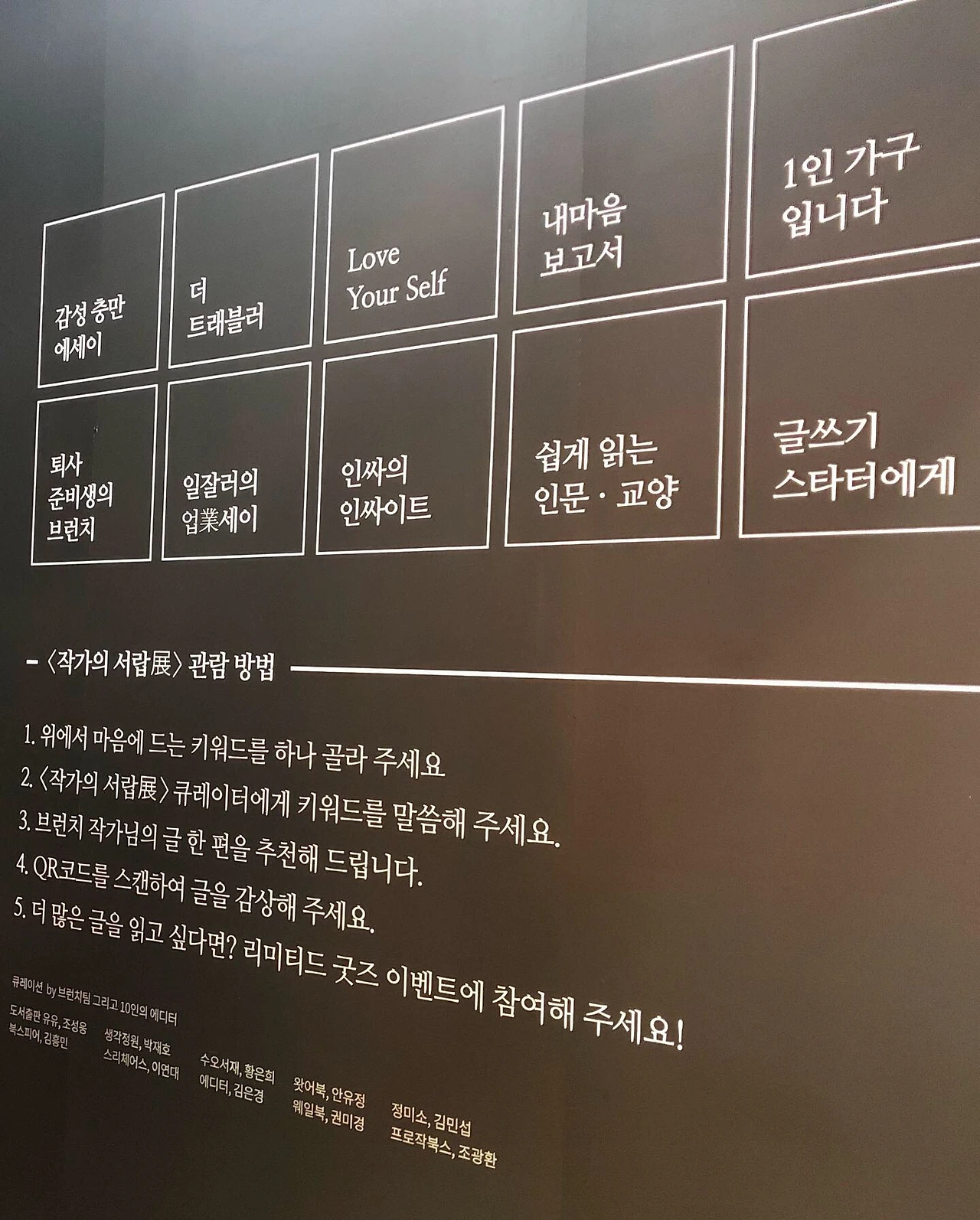 관람 방식이 아주 특별했는데요, 작가의 서랍전에 선정된 100편의 글이 10개의 테마로 나뉘어 있고 관람자는 마음에 드는 테마 중 하나를 고릅니다.