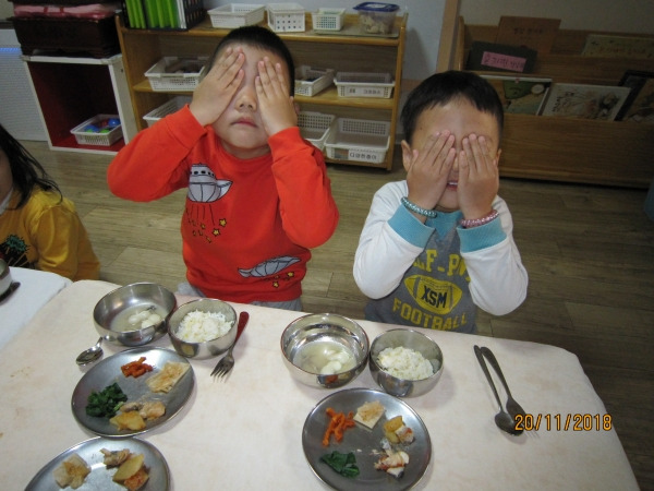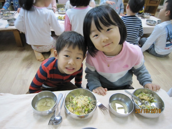 공동육아어린이집에 와서 마음이 놓이는 점들 중 하나는 '좋은 먹거리, 안심 먹거리'이다. 아이는 이곳에서 내가 집에서 신경 쓰는 것보다 더 좋은 식재료로 만든 식사를 하고 있다는 점과 먹고 싶으면 언제든지 더 먹을 수 있다는 점이다. 또한 반찬 양을 스스로 조절하게 하면서도 먹고 싶지 않은 낯선 반찬도 한 번쯤은 맛보며 그 맛을 기억하게 한다는 점이다. 어려서 한 번도 맛보지 않은 맛은 아이가 커서도 거부할 가능성이 높기 때문에 이 점은 중요했다.