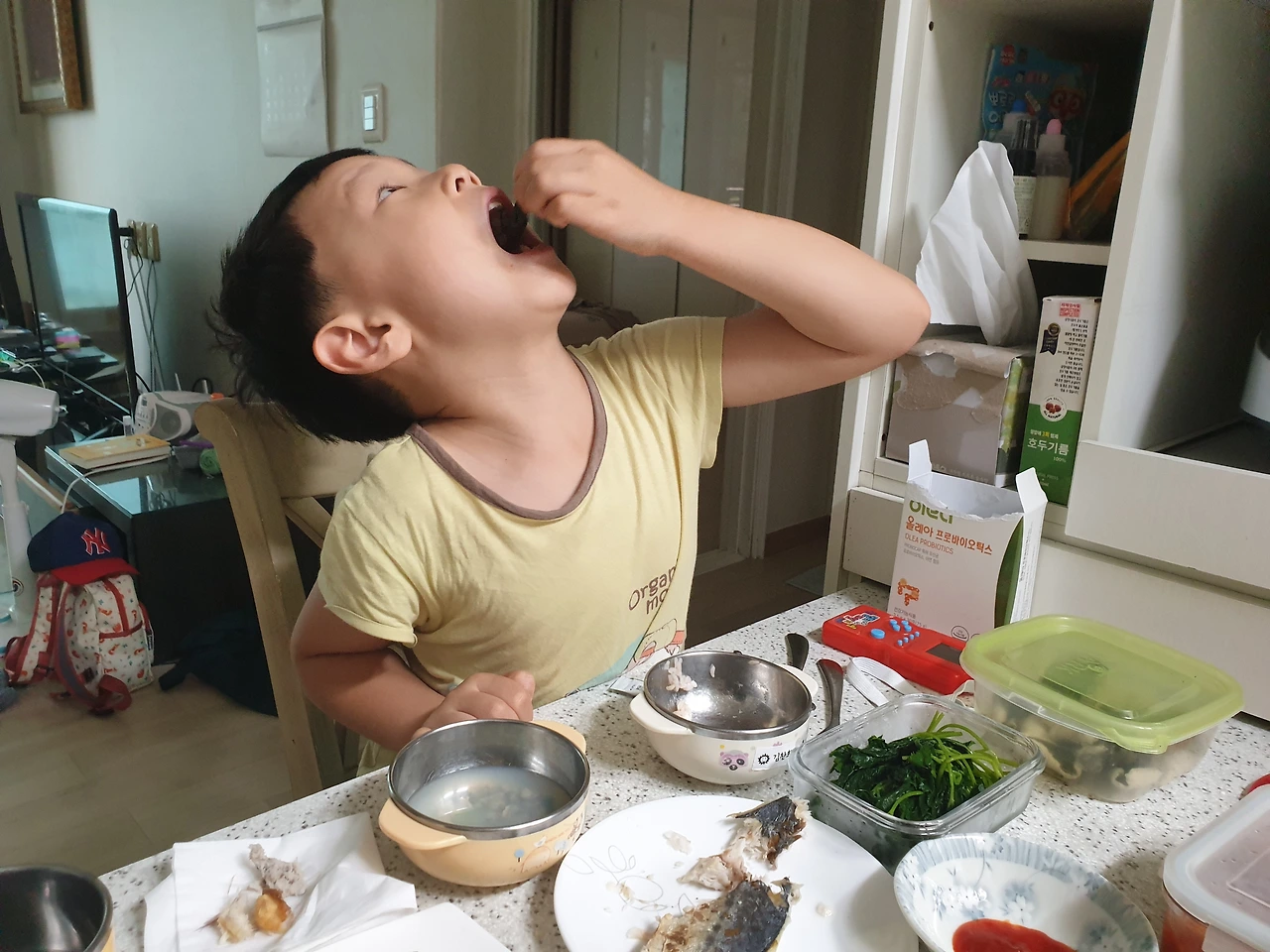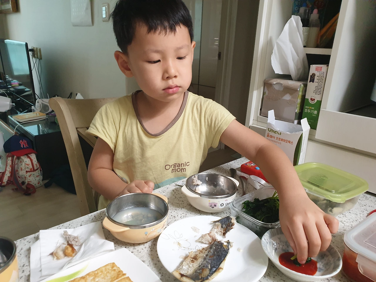참나물을 초장에 찍어 아침을 씩씩하게 먹는 7세 남아 © 두루미