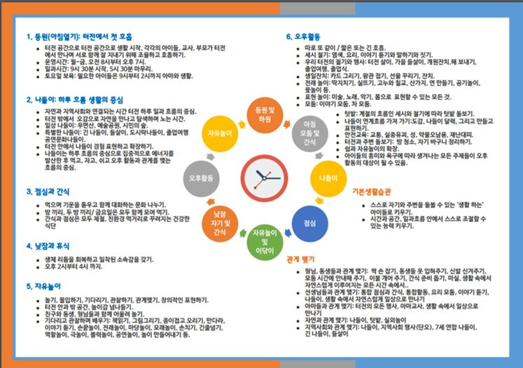 A. 발달단계에 맞게 아이들이 잘 자라날 수 있는 것에 대해, 그리고 아이들의 놀 권리에 대해 먼저 생각합니다. 또한 일상 속에서 자유놀이, 자연놀이를 하면서 아이들이 그 속에서 얻는 것, 느끼는 것이 더 많다고 생각합니다. 그리고 그 속에서 어떻게 주도적으로 놀이하고 관계를 맺고 갈등이 생겼을 때 어떻게 아이가 잘 풀어나갈 수 있을지 등에 더 가치를 둡니다.