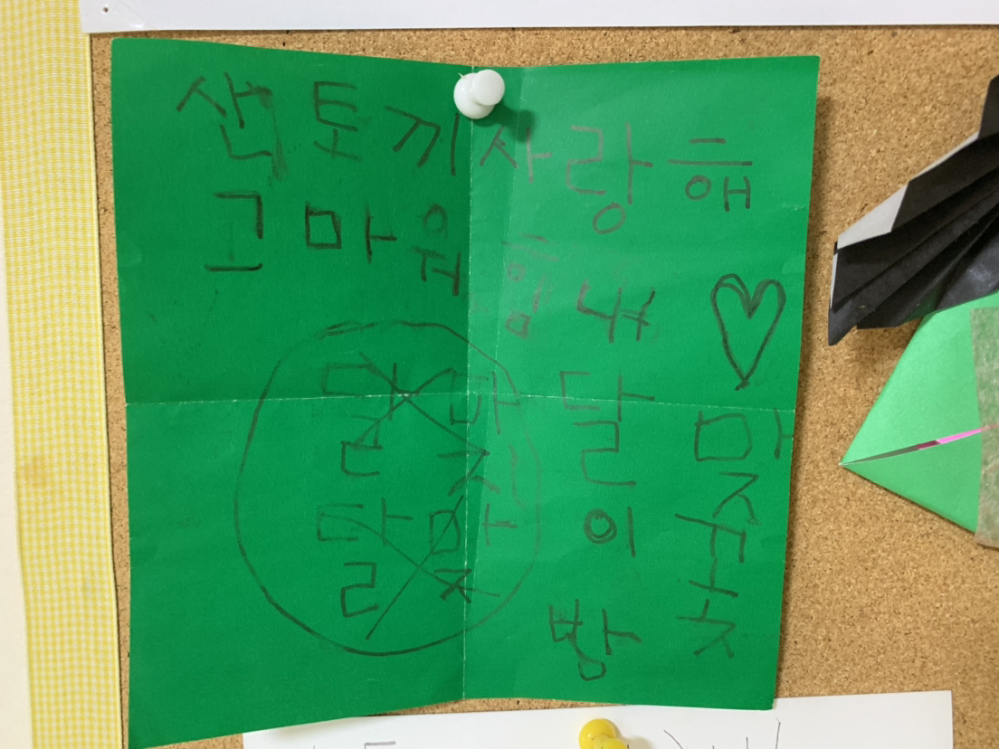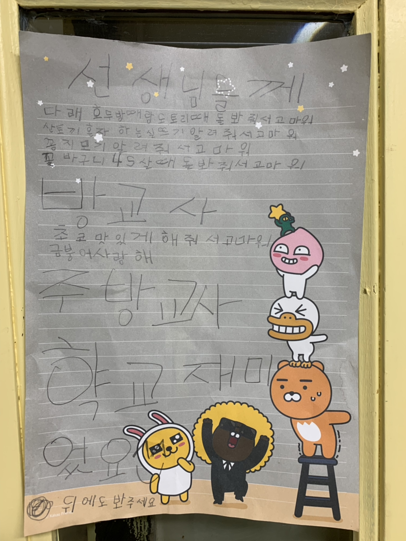 화장실의 작은 변기들이 귀엽게 눈에 들어왔다. 주방도 깔끔해 보였다. 시설을 번쩍번쩍 새 건물은 아니었지만 어린이집 졸업생들의 사진도 곳곳에 붙어 있었고 졸업생 아이들이 선생님에게 쓴 편지로 보이는 낙서도 있어 뭔가 정이 넘쳐나는 곳 같았다.