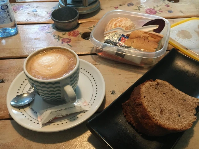 함께 받은 케이크는 약간 파운드 케이크 재질이었는데 가장자리가 바싹 익어 바삭한 캐러멜 향이 나는 맛있는 케이크이었다. 맛있게 먹고 화장실도 한번 갔다가 짐 챙겨서 길을 나섰다.