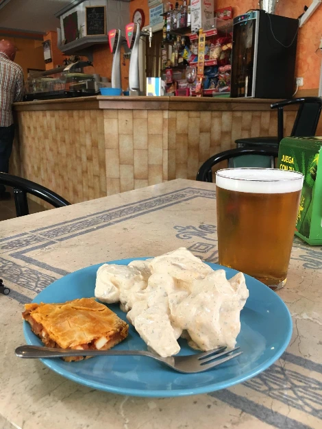 마을에 하나뿐인 구멍가게에서 내일 먹을 것 좀 사고 언덕 위에 있는 바에서 감자 샐러드와 참치 파이 하나를 사서 맥주와 먹었다. 마요네즈에 청양고추 같은 매콤한 걸 넣어 감자와 버무린 게 생각보다 맛있었고, 빵 사이에 참치를 넣어 구운 참치 파이도 맥주랑 곁들여 먹기 딱 좋았다. 음식 맛이 괜찮아 타파스 하나 더 시켰다. 오믈렛 위에 고추 장아찌 하나가 올라가 있었는데 맵고 짭짤한 맛이 부드러운 오믈렛과 잘 어울리는 느낌이었다.