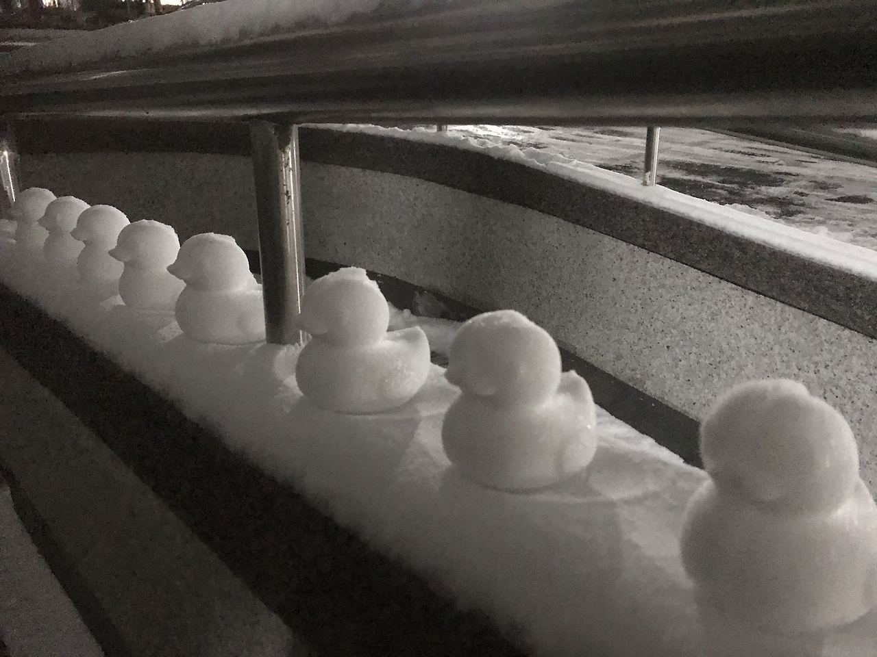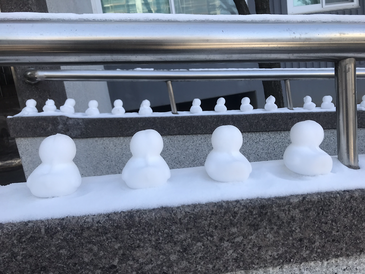 아버지는 눈똥을 능숙하게, 성인인 두 딸은 각기 70%만 완성하는 눈곰, 눈꼬맹이를. 엄마는 뭔지 모를 형상을 화단 턱에 만들어 늘어놓는다.