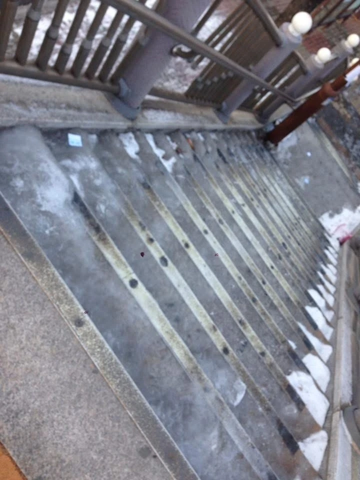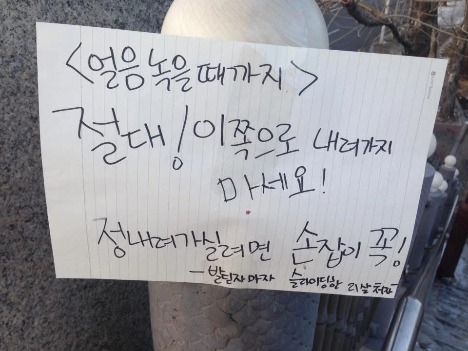 '얼음 녹을 때까지 절대! 이쪽으로 내려가지 마세요. 정 내려가시려면 손잡이 꼭'