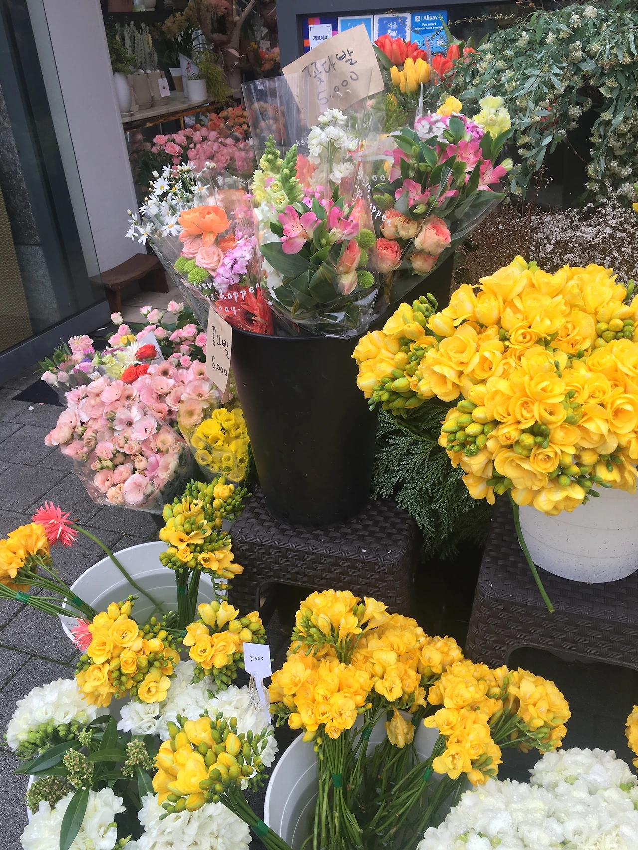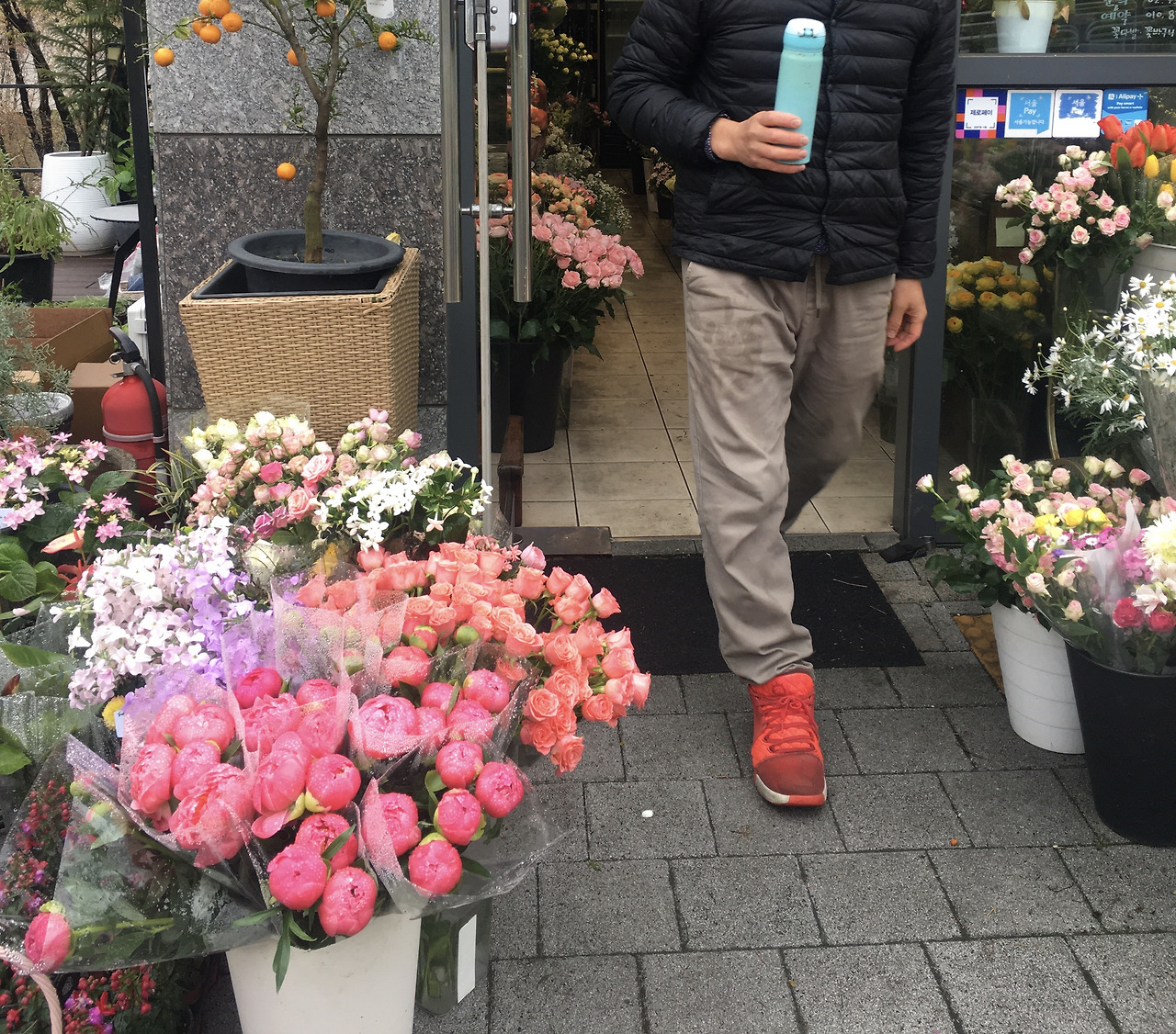 이제 그곳 출입 못한다. 그저 한참 올려다본다. 온갖 식물 플라워샵 앞. 그런 나에게 주인 나와 프리지아 한 가지 준다. 가게 이름 ‘비타민’. 주인의 색감. 형광빛 주황 운동화. 아주르azure 빛 텀블러.