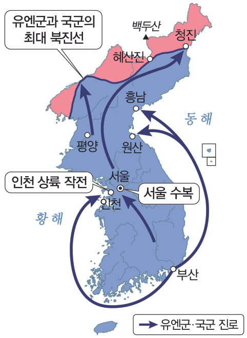 유엔군은 9월 15일 인천상륙작전을 감행하여 전세를 역전시켰다. 9월 28일 서울을 수복하고, 38선을 넘어 10월 1일 북한 영토로 진격해서 10월 10일 원산, 17일 함흥과 흥남, 19일에는 평양을 점령하고 압록강까지 진격하였다. 국군과 유엔군의 공격으로 북한 인민군은 대부분의 전투에서 일방적으로 후퇴했다. 소련 스탈린은 김일성에게 중국으로 도망가서 망명 정부를 수립하도록 권고하기도 하였다.