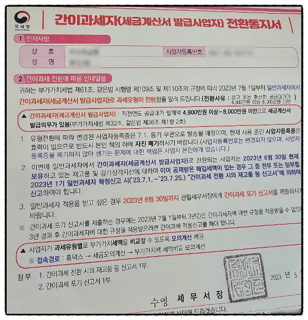 처음에 사업자등록을 하는 경우 간이과세자나 일반과세자 중에서 선택하여 사업자등록을 하게 됩니다. 사업자 등록을 한 뒤에 직전연도 공급대가 합계액이 4,800만 원 이상 ~ 8,000만 원 미만인 경우 간이과세자(세금계산서 발급사업자) 전환통지서를 받게 되는데 이러한 경우 세금계산서 발행이 가능한 간이과세자로 사업자 유형이 변경됩니다.