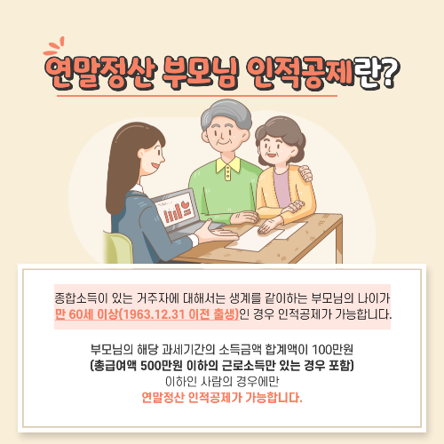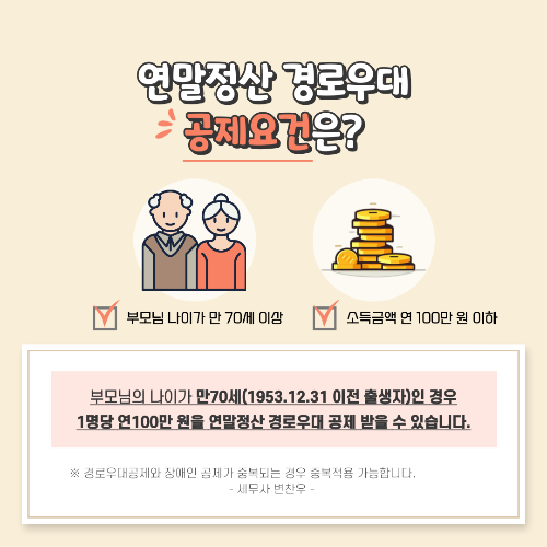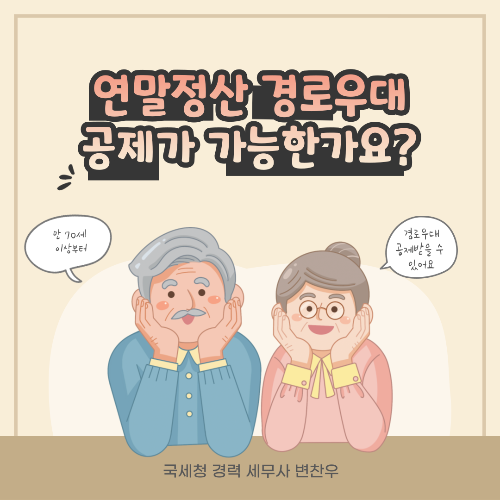연말정산 인적공제를 받는 경우 부모님뿐만 아니라 배우자의 부모님도 인적공제를 받을 수 있습니다. 다만 부모님의 경우에는 만 60세 이상인 경우에 인적공제가 가능한데요. 부모님의 연세가 만 70세 이상인 경우 인적공제뿐만 아니라 추가로 연말정산 경로우대 공제도 가능하기 때문에 자세한 내용을 변찬우 세무사가 알려드릴게요.