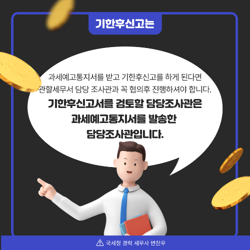 따라서, 과세예고통지서를 받아 기한후신고를 하게 된다면 담당 조사관과 꼭 협의 후에 진행하는 것이 좋습니다.