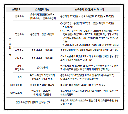 국민연금 같은 연금소득이 있는 경우 총연금액이 516만 원인 경우 연금소득공제 416만 원을 적용하여 소득금액이 100만 원으로 잡히게 됩니다. 따라서 국민연금의 경우 총연금액이 516만 원을 초과하는 경우 연말정산 인적공제를 적용받을 수 없으며, 양도소득금액이 연 100만 원 이상인 경우에도 연말정산 인적공제 적용을 받을 수 없습니다.