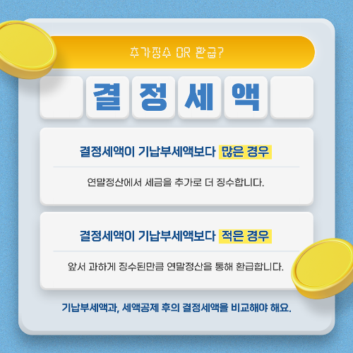 연말정산 환급금은 기납부세액이 연말정산 결정세액보다 큰 경우 발생하며, 근로자가 이미 납부한 소득세를 한도로 연말정산 환급금이 발생합니다. 연말정산 차감징수세액이 마이너스인 경우 연말정산 환급금이, 플러스인 경우에는 추가납부세액을 납부하게 됩니다.